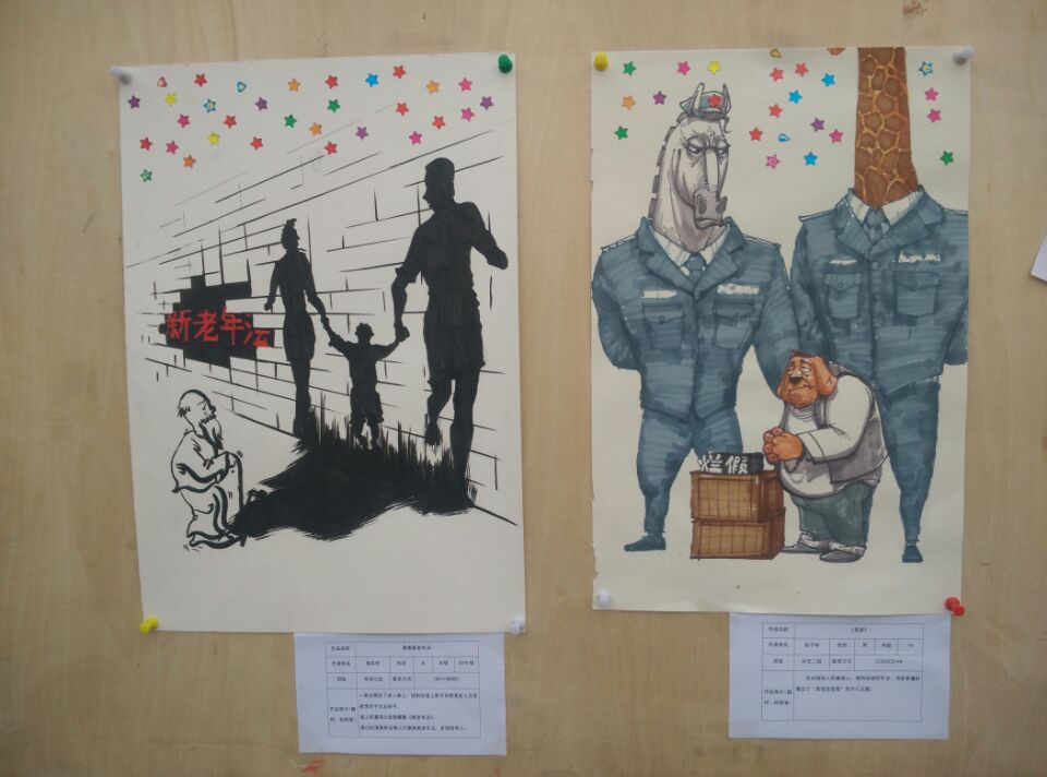 此次漫画的参展作品均由美院的学生们独立自主完成,前后共征集到三十余幅作品,且风格形式多样,质量上乘,同学们凭借自己的专长,用画笔为观众展现出一个个生动诙谐的场景,并带有一定的讽刺意味,使观者捧腹的同时又有所思考。
