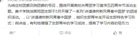 为响应校团委及院团委的号召,围绕开展高校共青团学习宣传五四青年节活动主题。美术学院油画班团支部于5月开展了一系列“讲道德树新风青春中国梦”的团组织活动。本次系列活动紧密结合主题并结合本支部同学专业特色,以“讲道德树新风青春中国梦.向雷锋同志学习”学习交流会为主体,组织支部青年走开设支部特色学习形式:微讲座,有利地增强了支部青年的学习成效,提高了学习内容的吸引力,另一方面也锻炼了支部主讲人同学的表达能力。总体来看,本次系列学习活动较为圆满,活动比较成功,达到了预期效果。