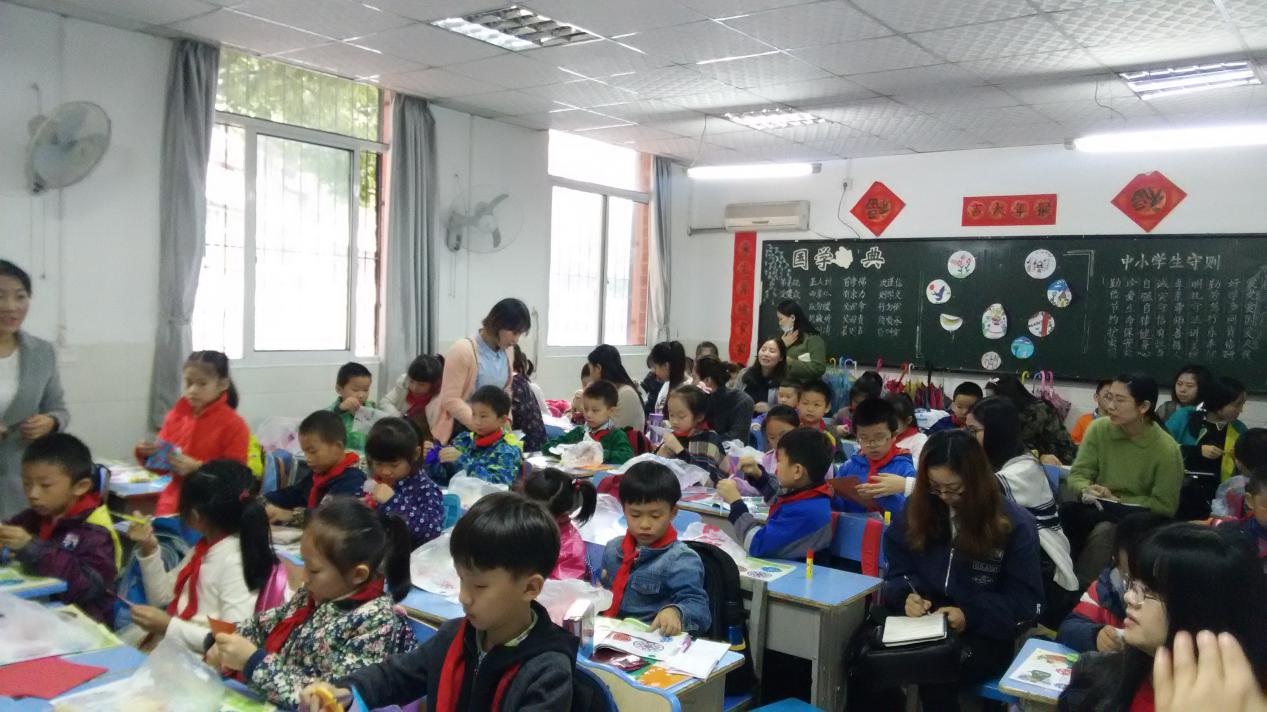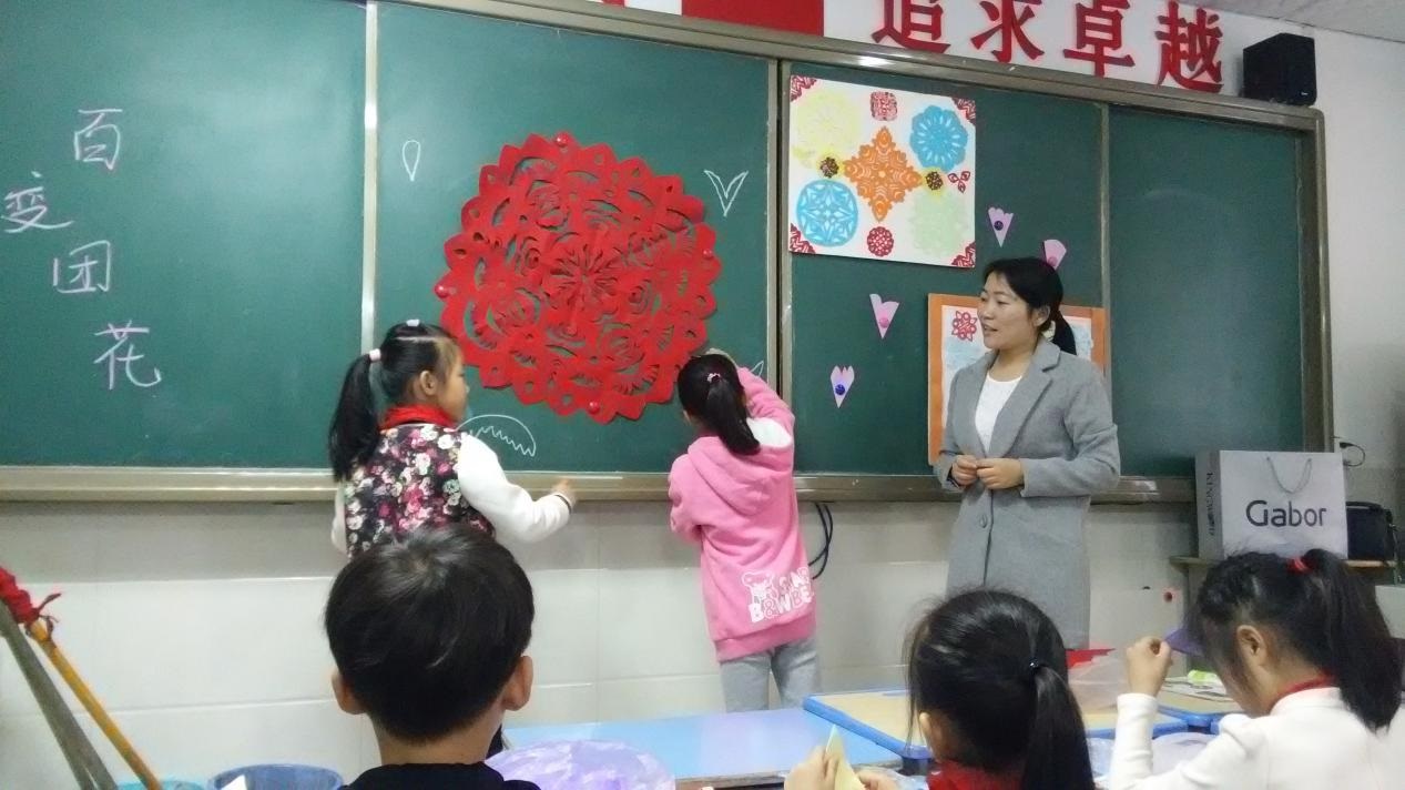 在卓刀泉小学二年级(1)班上午第三节美术课上,15届教育硕士邹银萍老师的《百变团花》手工剪纸课课堂积极活跃。上课一开始,邹老师首先展示了各种形状准备的“团花”剪纸作品,激起学生的学习兴趣。接着提问学生关于团花剪纸在日常生活中的用途,并要求学生在黑板上画出展示的“团花”工具作品中不同的纹饰。紧接着邹老师演示团花纸的折叠方法,并由老师和学生互相配合共同剪出一个“团花”作品。