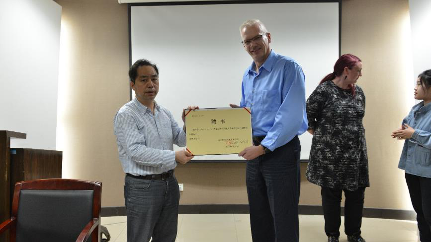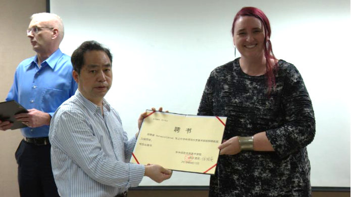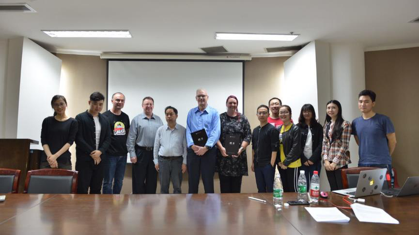 Wes教授、Rebecca教授被聘为我院客座教授,美术学院院长徐晓庚教授为他们颁发聘书并合影留念。本次学术交流为我院数字媒体艺术学科的发展提供了新的重要机遇,艺术携手科技,必将培养出更多为时代所需的创新型文化艺术人才。