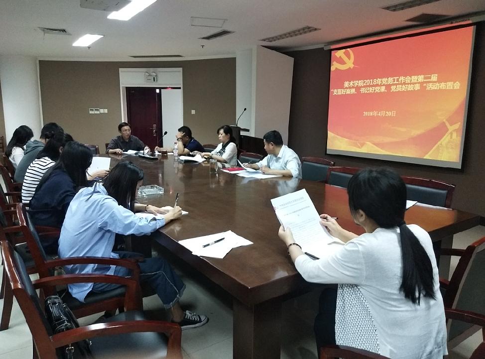 2018年4月20日美术学院分党委在十号楼北楼五楼会议室召开了“美术学院2018年党务工作会暨第二届“支部好案例、书记好党课、党员好故事”活动布置会,会议由学院分党委书记罗贻文主持,分党委副书记潘珞琳、党务干事喻颖以及各支部书记到场参加会议。