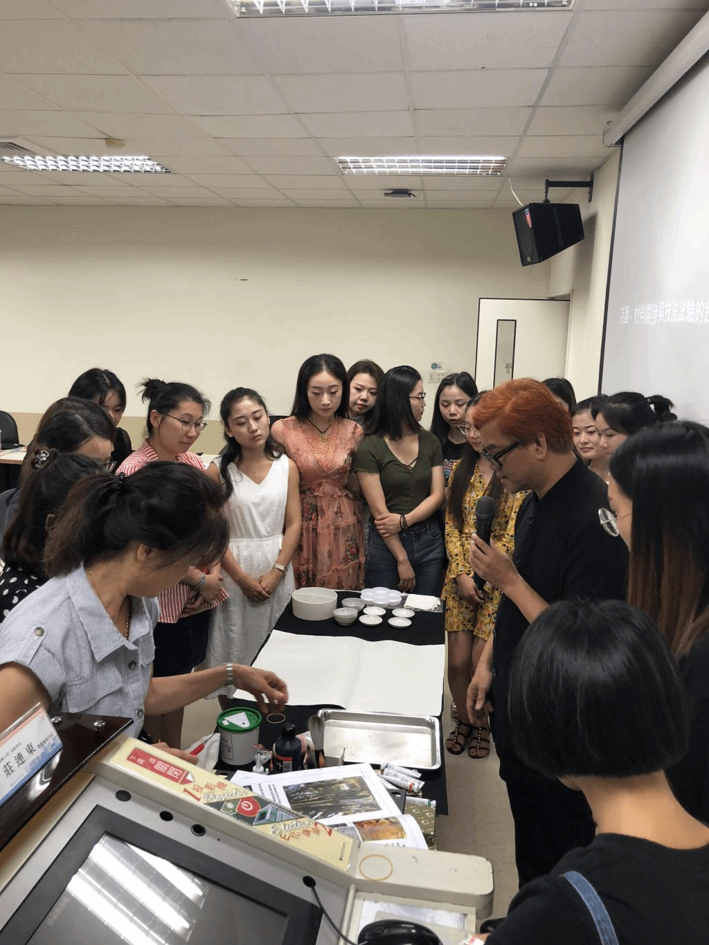 师生一行甫抵达本次交流访学的学校——台湾师范大学(下称台师大),校方安排了简短并且温馨的欢迎仪式,茶点、酒水、让一路饥肠辘辘的学生们倍感温暖。之后台湾师范大学组织方趁着日落之前,安排了助理带学生快速地了解了校园的情况和周边的环境,以方便华中师范大学美术学院的学生更快地融入在台北的学习。第二天早上九点,同学们在台湾师范大学的第一次授课按时开课,台师大美术系系主任庄连东教授亲自为学生演示台湾彩墨技法。台湾地区的近代中国画创作基本上以“渡海三家”——黄君璧、张大千、溥心畬三人的创作风格为基础,在后来的发展中台湾彩墨技法继承了“岭南画派”的技法,后融合了日本彩墨技法与观念,是以胶彩技法为主干,同时配合各种综合材料技术的绘画门类。庄教授以“树”的肌理为例,演示了如何用滚筒、江湖、毛笔等综合工具快速地呈现传统笔墨皴法可以呈现的肌理效果。中午稍作休息之后,下午台师大美术系王琼丽教授以个人的创作经验出发,结合她对台湾少数民族艺术的观察和研究,为同学们带来了一堂精彩的台湾当地审美趣味大集合的美术讲座。