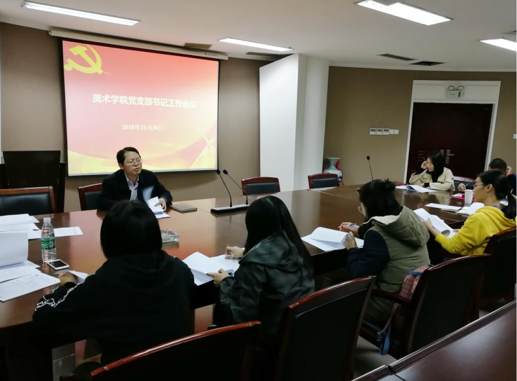 2018年11月30日,美术学院分党委在美院五楼会议室召开“美术学院党支部书记工作会议”,参加会议的有学院分党委书记付义朝、院党务干事喻颖、行政支部书记黄慧芳、美术教育与造型艺术系支部书记陈曦、艺术设计系支部书记庄黎以及本科生、研究生各支部书记,会议由院分党委付义朝书记主持。