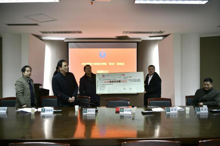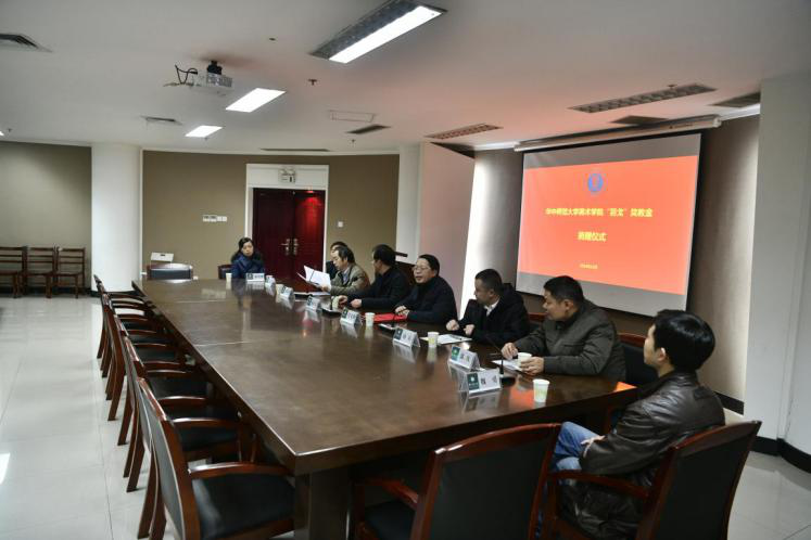 2018年12月25日上午8点30分,武汉博尔雅教育培训中心有限公司捐赠美术学院院10万元用于设立“羽戈”奖教学金捐赠仪式在美术学院五楼会议室隆重举行。出席此次捐赠仪式的捐赠方代表有:华中师范大学宁波校友会常务副会长、武汉博尔雅教育培训中心有限公司董事长韩箐、武汉博尔雅教育培训中心有限公司副董事长汤乐,华中师范大学副校长蔡红生、华中师范大学校友工作与合作发展办公室副主任郭庆、美术学院党委书记付义朝、院长徐晓庚、党委副书记潘珞琳、副院长王文新、工会主席魏勇等出席了捐赠仪式。美术学院院长徐晓庚主持仪式。