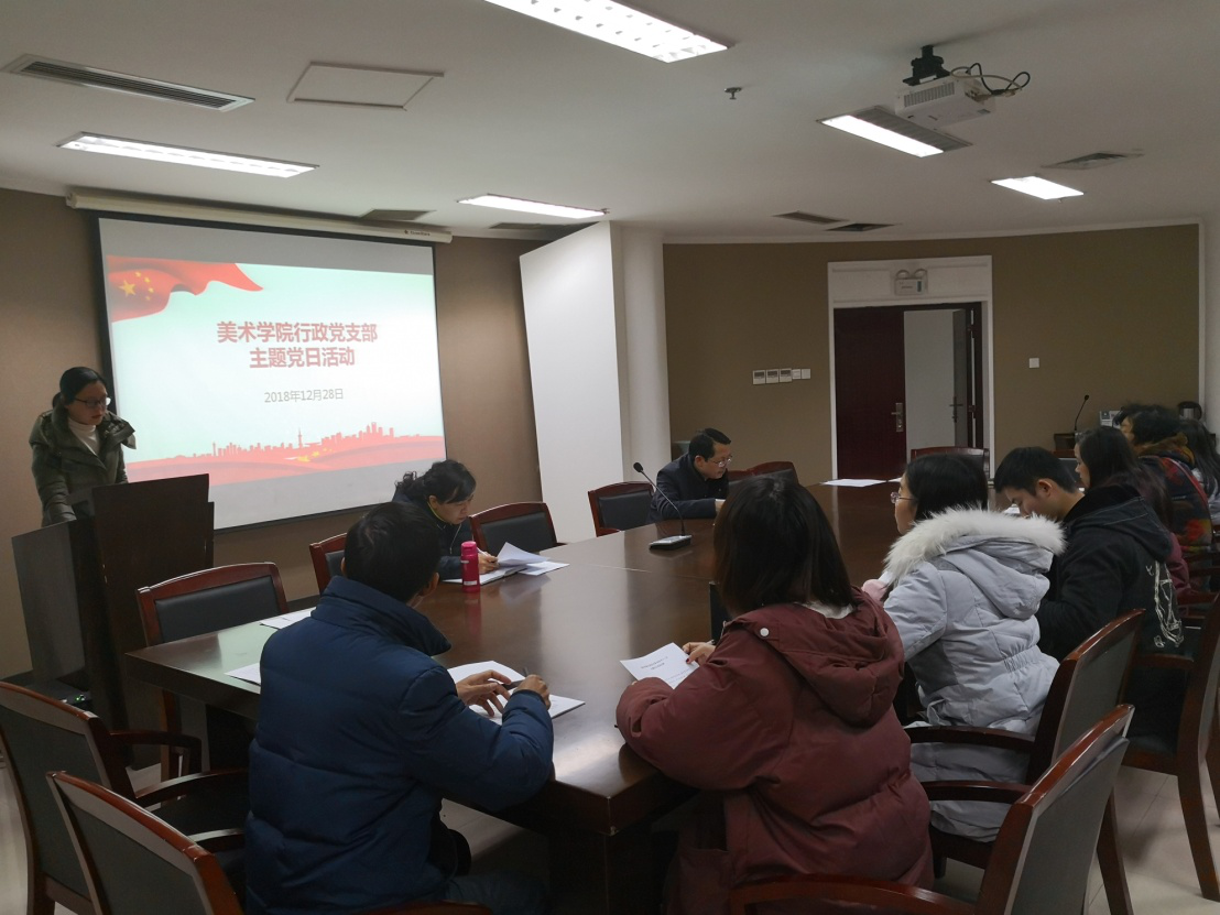 2018年12月28日上午10点,美术学院行政党支部十二月主题党日活动在学院五楼会议室举行。本次党日活动主要围绕两个内容进行,一是学习习近平总书记在庆祝改革开放40周年大会上的重要讲话,二是学习《中国共产党支部工作条例(试行)》。