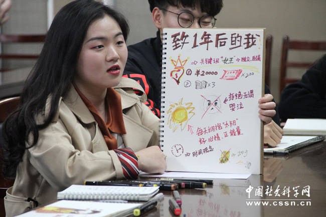 大二学生陈心一为师生们解读了她的画:“我要学会独立、自强。近期,打算读3本书,赚2万元钱。我已经找了一份兼职,这个周末就去上班。我每天要保持好心情、正能量,还要培养时间观念。”大二学生李佳昱也表示,自己的小目标是阳光自信,不熬夜,多读书。