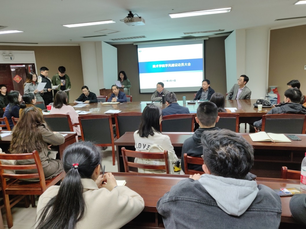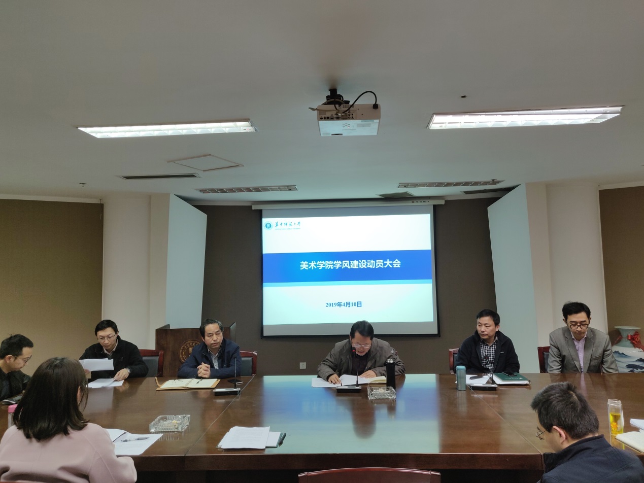 为全面落实学校《关于开展2019年学风建设月活动的通知》,进一步落实立德树人根本任务,美术学院于4月10号下午在五楼会议室开展学风建设动员大会。到场学院领导有美术学院党委书记付义朝、院长徐晓庚、副院长王文新。会议由学院分党委书记付义朝主持,各教研室主任、学工办和教学办老师、全院各年级学生干部、学生党员代表、寝室长代表等参加了会议。