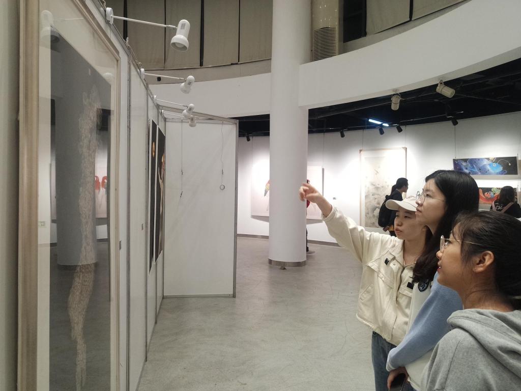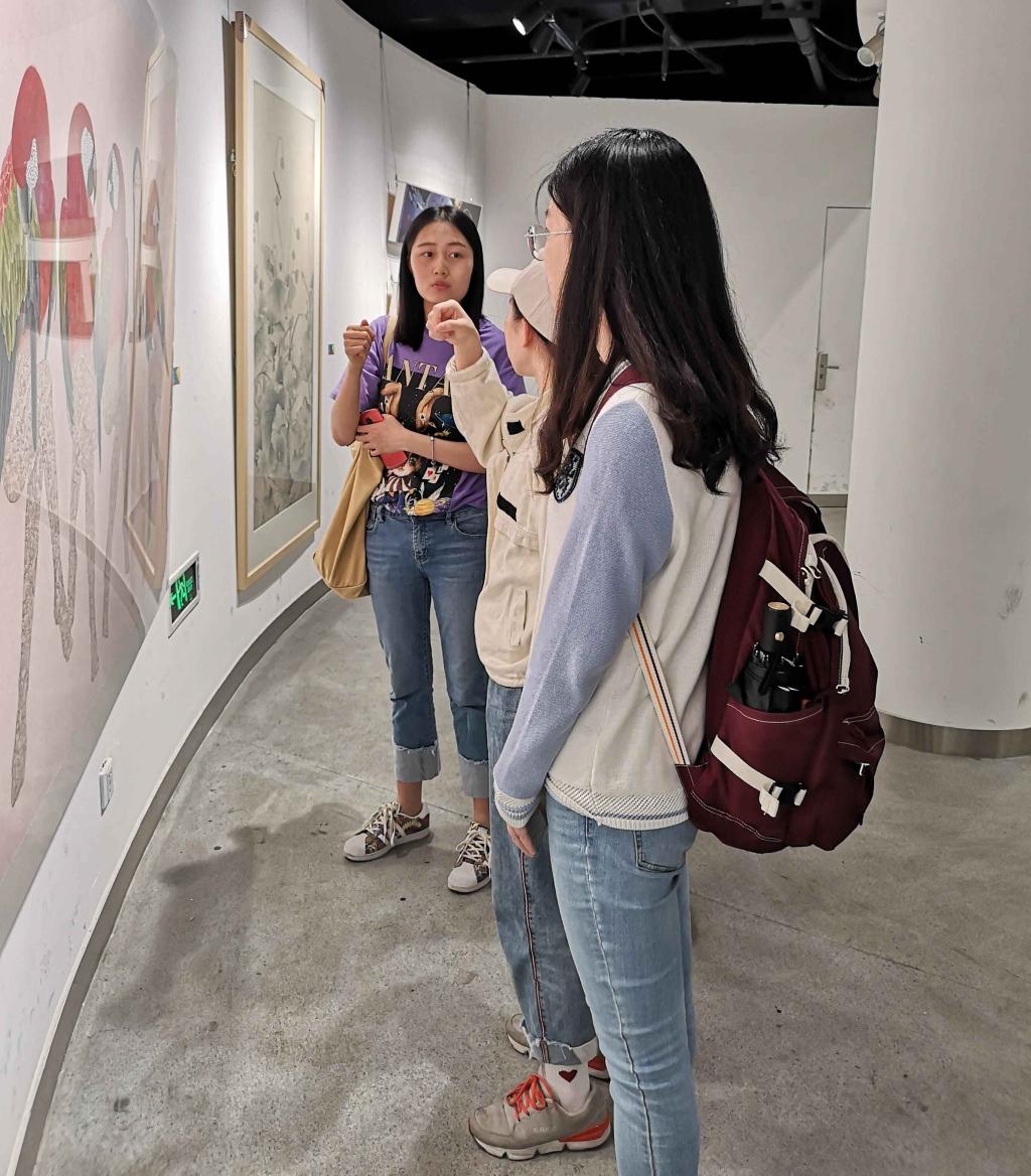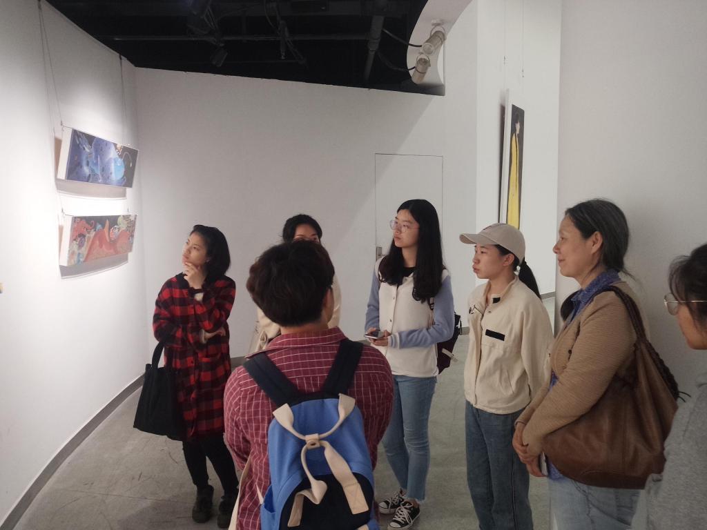 在参观展览环节中,高老师带领各学院的学生参观了毕业展览,解答了他们关于艺术创作和美术鉴赏的一些问题。