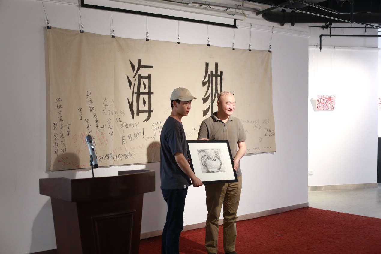 紧接着,姚古东上台发言,并向学院捐赠自己的画作。“大部分题材都是源于自己于海边的经历,其中加入了‘符号式’的隐喻观念,并结合实物铝板喷漆、铜版套色等形式进行创作。”姚古东讲述了自己的创作思路,本次个展的作品也是姚古东同学四年艺术学习的结晶。