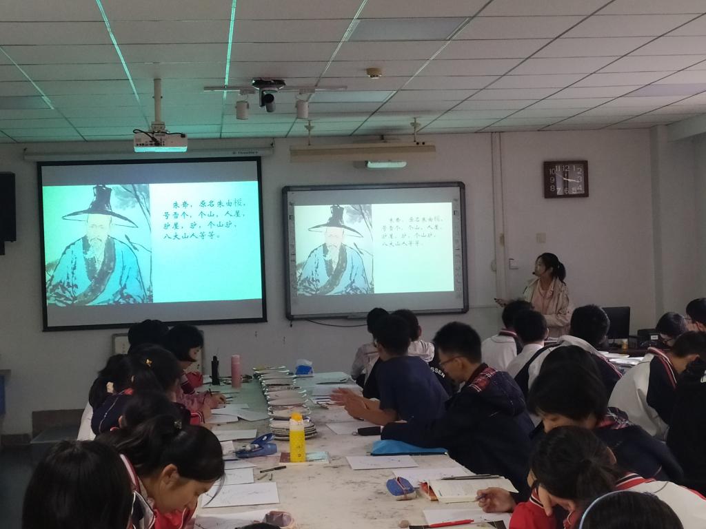 华中师大一附中(高中部)实习老师张婕的执教课题为《托物寄情——一个用表情包对抗皇权的男人:朱耷》,以歌声“确认过眼神”开场,活跃课堂气氛,让同学们为动物点睛导入课堂,每位同学直接参与课堂教学活动,生动活泼地引出朱耷笔下动物白眼朝天的绘画特点。张老师以朱耷一生的经历对应同时期绘画为主线,分别对他人生出家、还俗、成熟,三个时期的绘画作品对比赏析,巧妙地穿插了有趣的小故事,精心设计教学结构,对教学资源有效整合,激发学生学习兴趣。高一(16)班的同学们积极参与课堂,在故事中深深体会朱耷的绘画情感,学会用自己的方式表达感情。