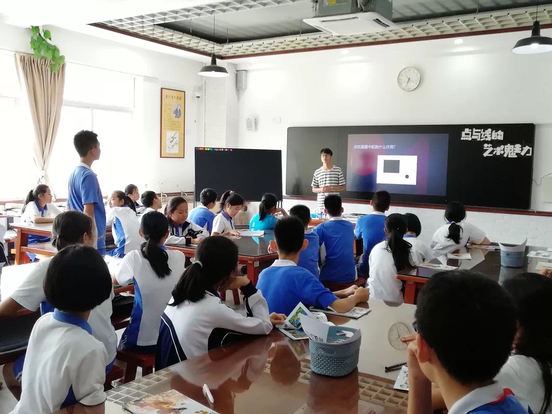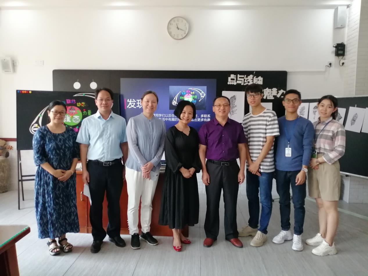 2019年10月22日上午,华中师范大学美术学院副教授高细媛、汪楚雄到松岗实验学校进行教育考察及教学指导,实习生华中师范大学美术学院宁恩念同学对两个月以来的实习成果进行展示,为七年级五班的学生上了一节《点与线的艺术魅力》。松岗实验学校的副校长张艳、教师发展中心主任黄友生、学生发展中心副主任董德国、小学部一年级级长李锦涛,小学部一年级班主任及美术组全体教师观摩了本次课堂教学。
