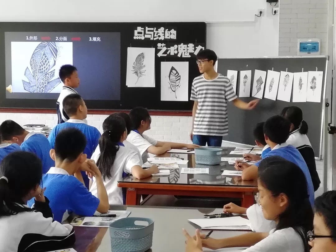 上课内容涉及点线面的艺术感受,并组合点线面对羽毛进行装饰。宁恩念同学在课堂中利用写意国画和讲故事的形式为学生讲述了点线面的艺术感受,随后宁恩念同学当堂为学生进行示范,装饰画。教学环节衔接得当,语言精炼明晰,板书以剪纸的方式展示等,很好的展示了两个月以来在松岗实验学校的所学、所思、所悟。