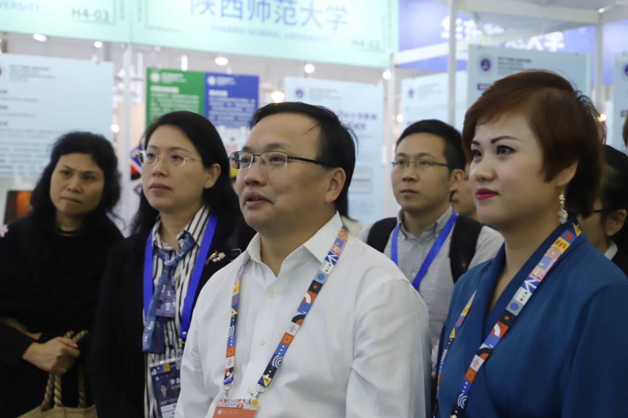 会议结束,夏立新副校长,本科生院万坚院长,教师教育学院何静院长,教育信息技术学院杨九民教授等参会领导到达华中师范大学展区现场考察慰问我校参赛师生。我项目成员向到场领导展示了项目多媒体资料和文创作品,并认真听取夏校长提出的意见和建议。对于项目成果展示,夏校长对项目成功表示肯定,鼓励师生走在教育创新前列,积极投身于国家教育改革建设潮流,为校争光。