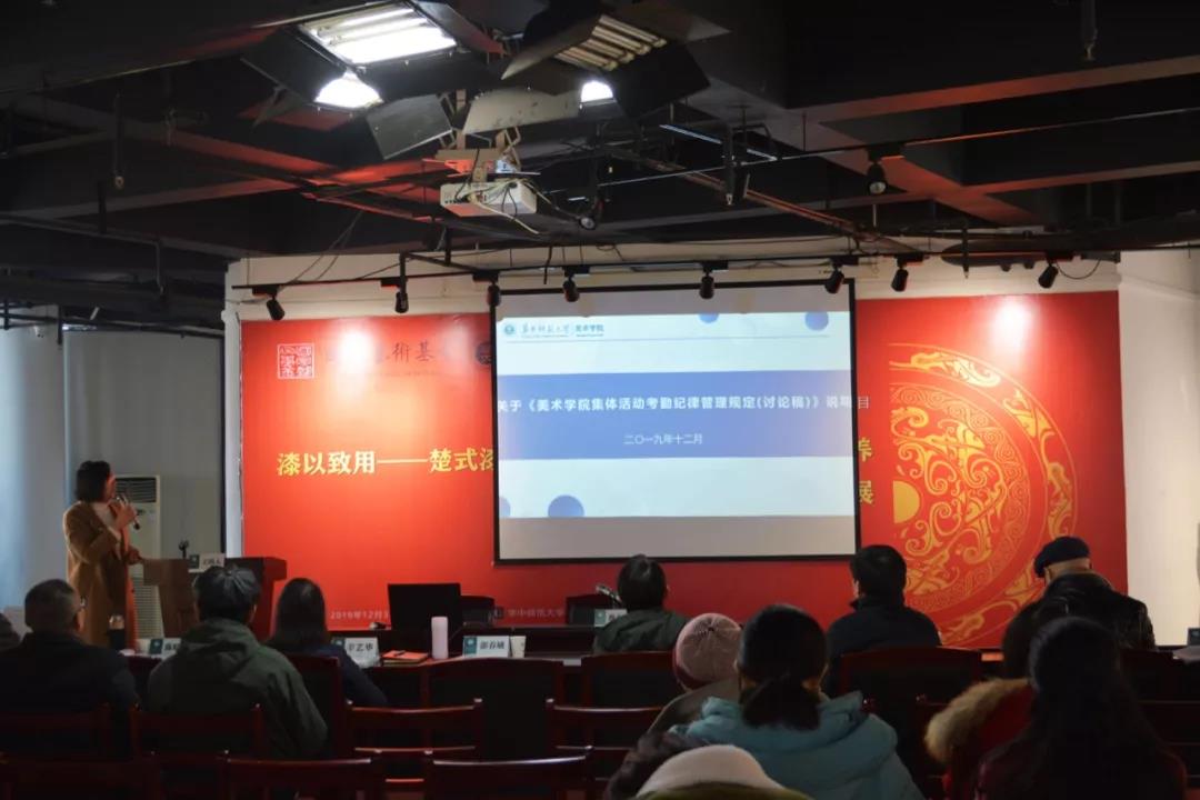 李宪玲副书记对《美术学院集体活动考勤纪律管理规定(讨论稿)》进行起草说明。她指出,该管理规定是基于“规范学院集体活动纪律管理”、“增强教职工集体意识与凝聚力”、“保障学院集体活动正常进行”、“学校的相关文件支持”等多方面因素起草成文,制度主要内容包括集体活动范围、考勤规范、请假制度、缺勤处理以及其他相关说明。