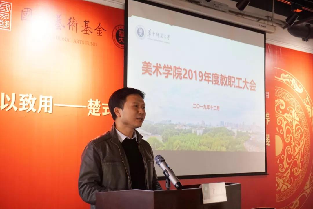 接着,由辛艺华院长作2019年度美术学院工作报告。辛院长首先对我院教师作出的发展成果表示肯定,对奋斗在一线的教职工表示感谢,其次对本年度工作进行了回顾。在党建工作方面,深入开展的“不忘初心、牢记使命”主题教育成效显著,着重加强特色支部建设,党员教育与日常管理工作也有条不紊展开。在人才培养方面也取得重要进展,学生思想政治教育彰显成效,科研工作达到新高度。辛院长强调,学科与教师队伍的稳步推进,学科发展与美育特色工作的有效融合,虽推动了美育工作的发展,但同时也要清醒的认识到学院的基础发展相对薄弱,人才培养与课程设置存在结构性矛盾,希望在2020年能够抓住机遇、凸显特色、把握重点、落实实事,将学院各项工作带来质的飞跃。