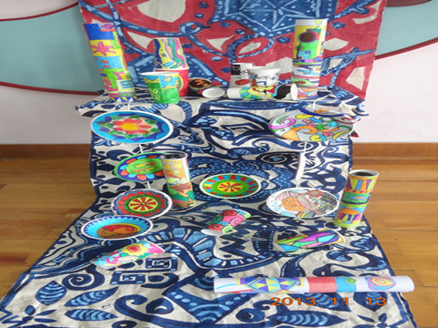 为此次公开课,水果湖二中实习小组4人,精心准备。在柳老师的指导和传授下,我们进行了公开课前的准备活动。1.在白色的布上,用丙烯颜料画出装饰画的花纹图样。创作出蓝色调布和红色调布各一张,作为公开课内容展示的背景。2.反复的推敲课件。从选图片到视频,从文字内容到编排,一次次的修改,一次次的精炼,一直到指导老师通过为止。3.准备作品材料。为公开课上的作业内容,我们挑选了各种材料,然后进行课前实验,为公开课上作品的效果做了充分的筛选工作。
