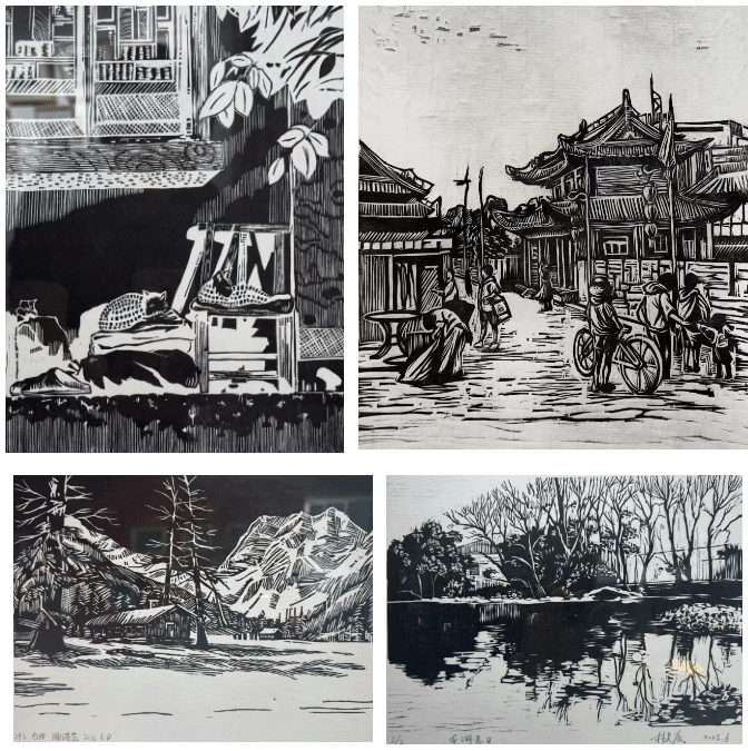 开展创作素材采集活动,并进行木刻黑白语言转换专项练习。通过结合中外木刻经典作品,重点剖析“刀味”“木味”的独特审美特征,帮助学生建立对木刻艺术语言的感性认知与理论理解。采用“理论导入-观察分析-实践验证-研讨提升”四步法教学法,学生基于前期素材采集与黑白语言练习,修正完善创作方案,并将写生稿转化为黑白草稿,在实践中深化对木刻语言的运用能力。通过上述训练,重点提升学生从生活感知到艺术转化的综合能力,实现创作思维与表现技法的同步提升。