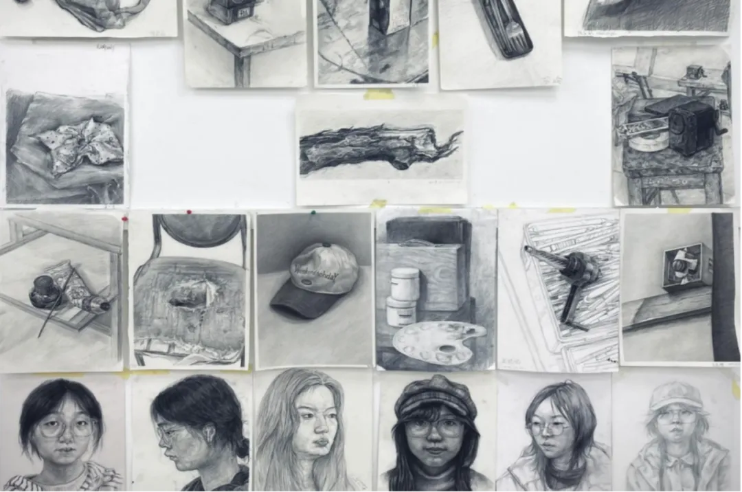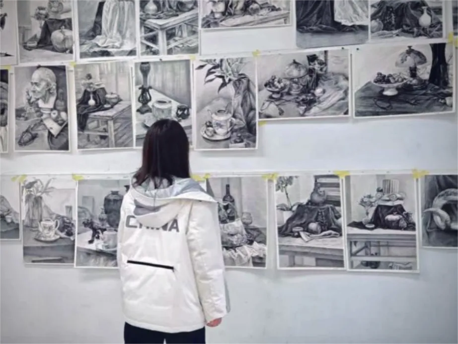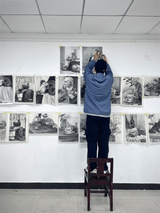 通过该课程的学习,具象素描不是机械复制的工具,而是将三维世界转化为二维平面的思维实验。在课堂中,素描不仅仅是技巧的堆砌,更是一种思维方式,拒绝“画符号”的惯性,要求学生成为“观察者”,着眼于周围的环境, 从对绘画对象的选择摆设, 到对画面构图的安排和构建, 再到触摸物象肌理、感受光影变化、探索力学平衡,通过画笔拆解与重构“真实”,实现从“画得像”到“画得深”的视觉经验颠覆。
