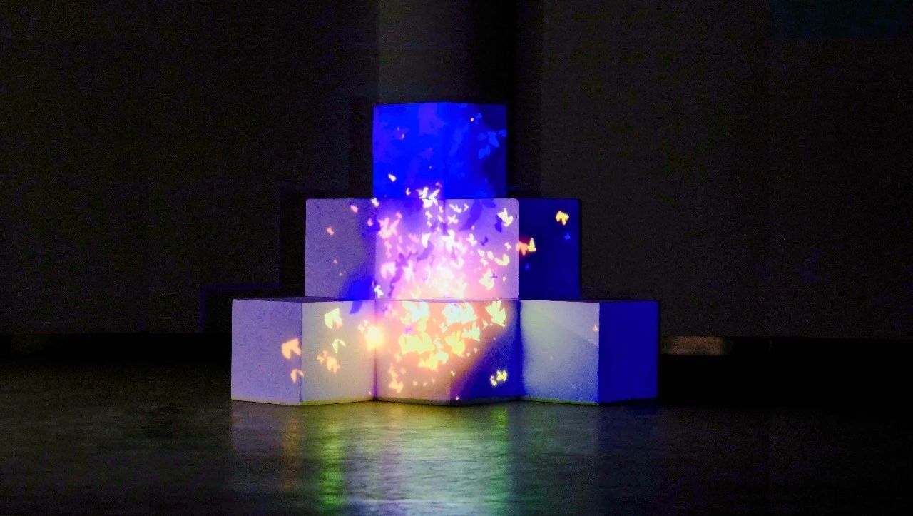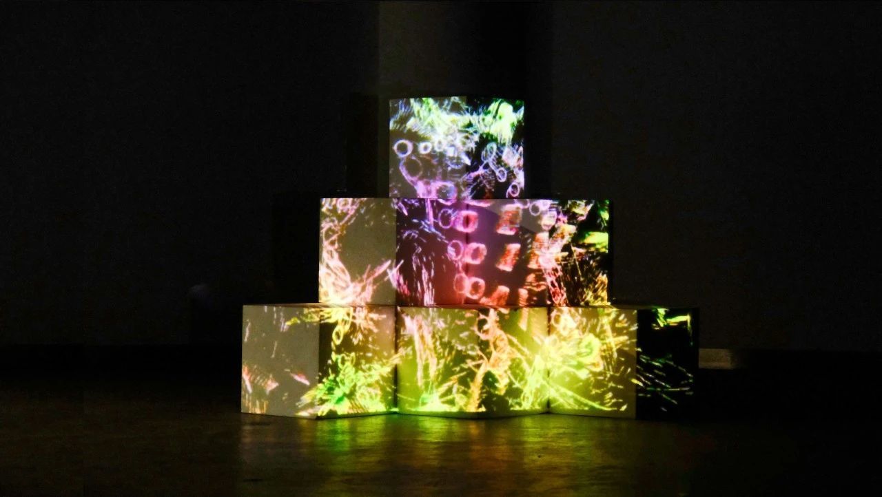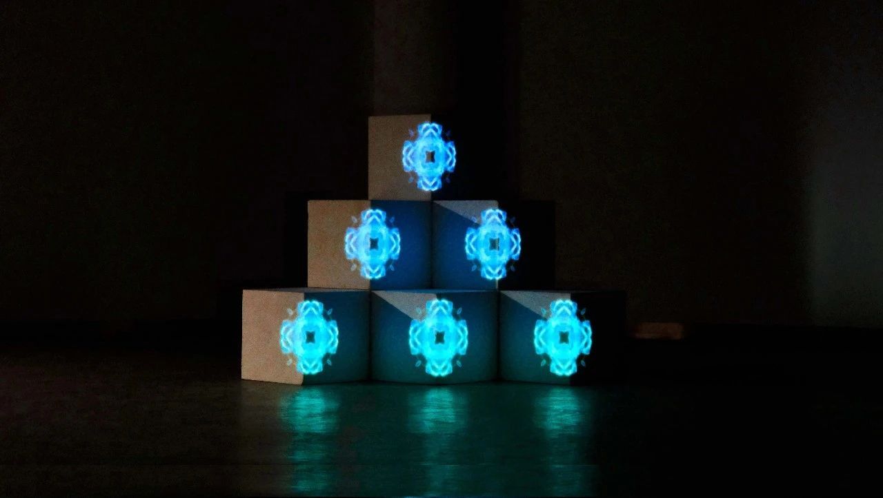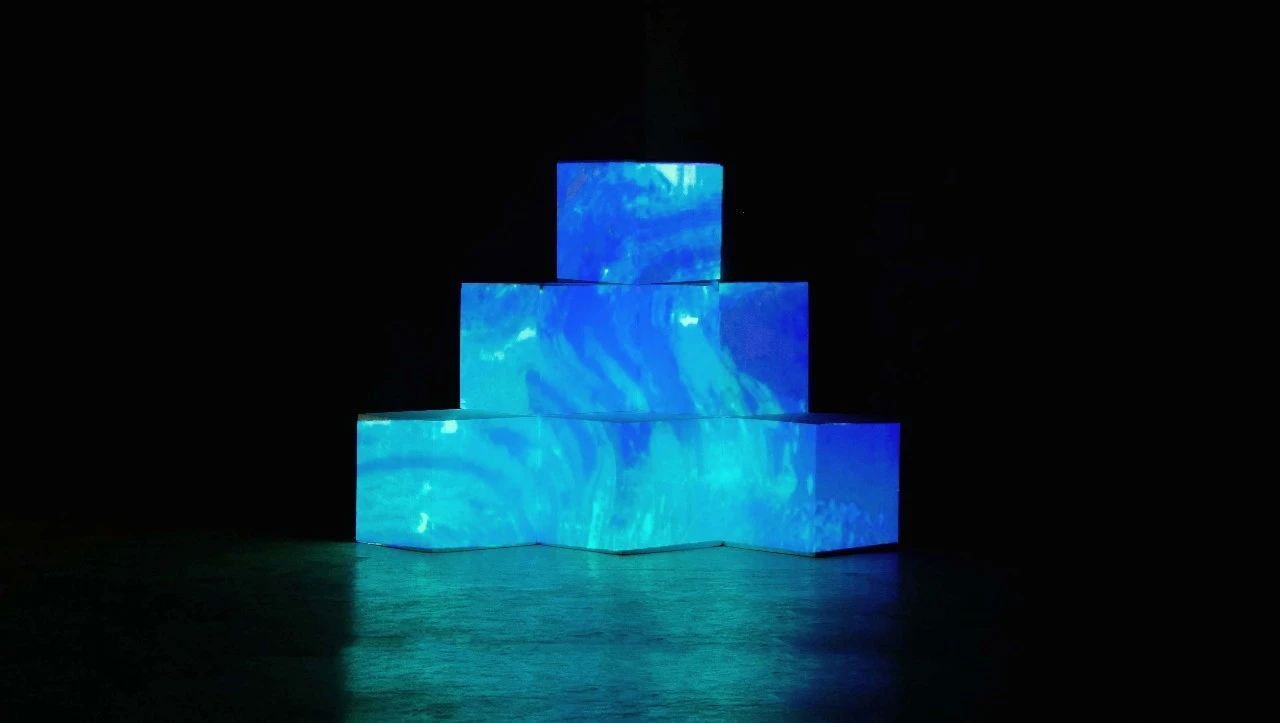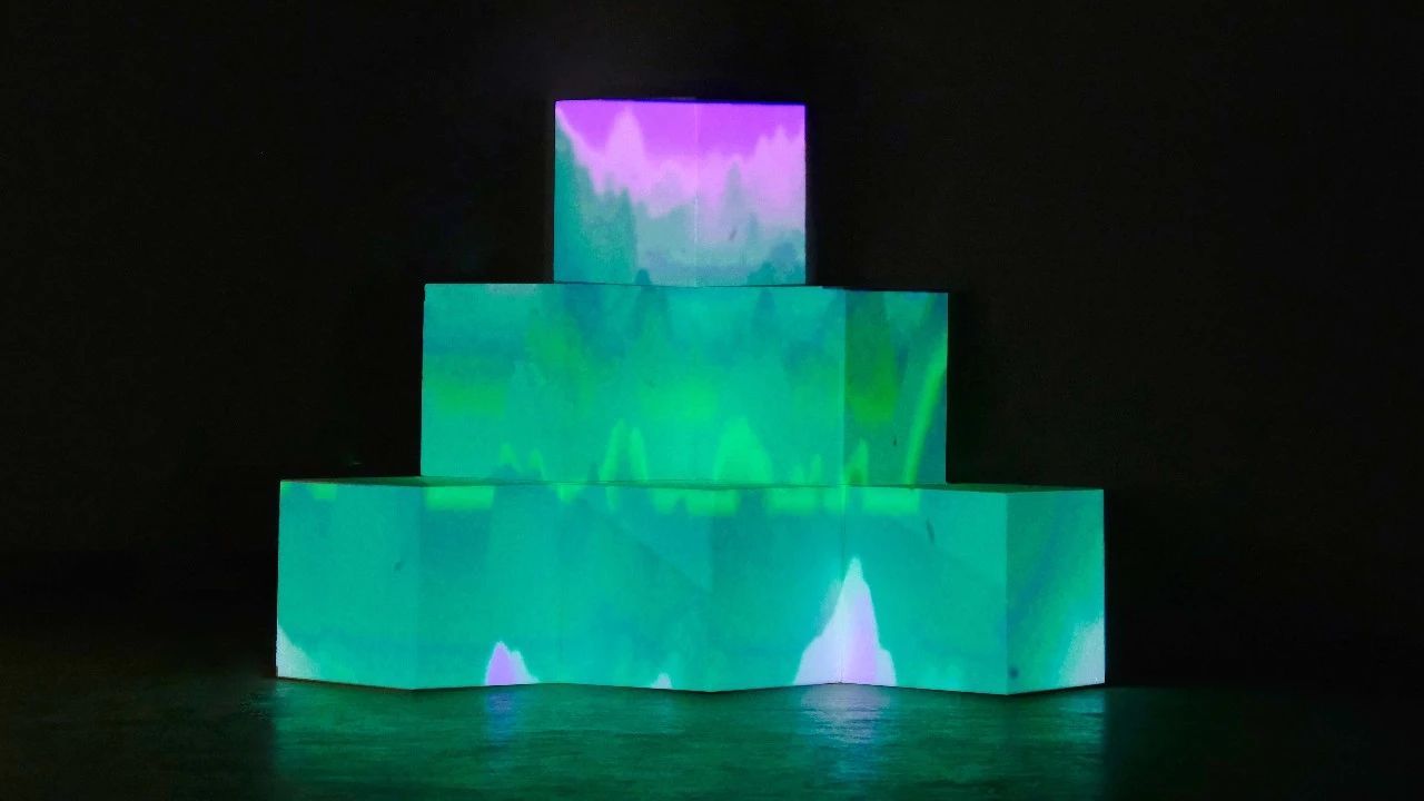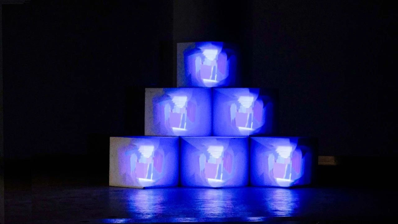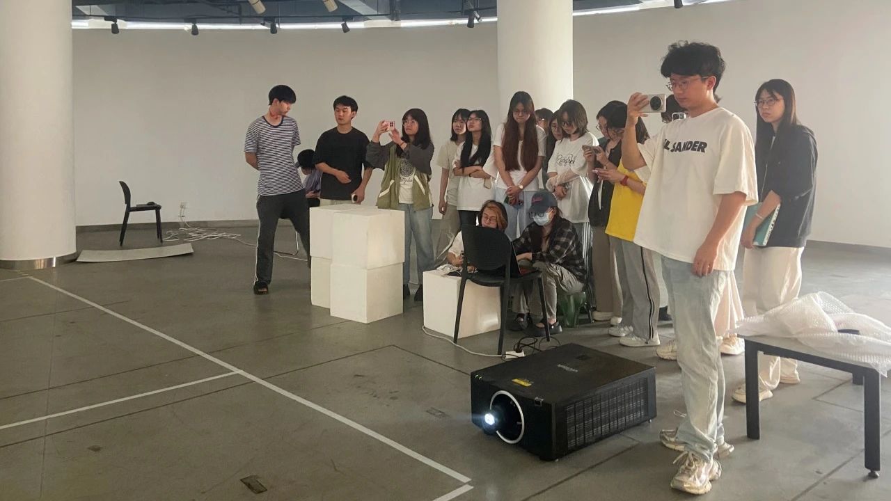 空间构建与展览布置:课程后期,学生将作品从屏幕转化为空间装置,结合投影映射技术与空间布局进行布展尝试。每组作品最终形成一段不超过1分半钟的音画互动内容,通过墙面投影、地面反射或结构映射,将虚拟内容与物理空间深度融合。