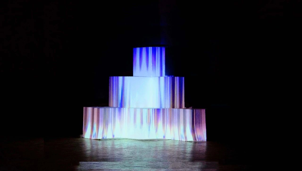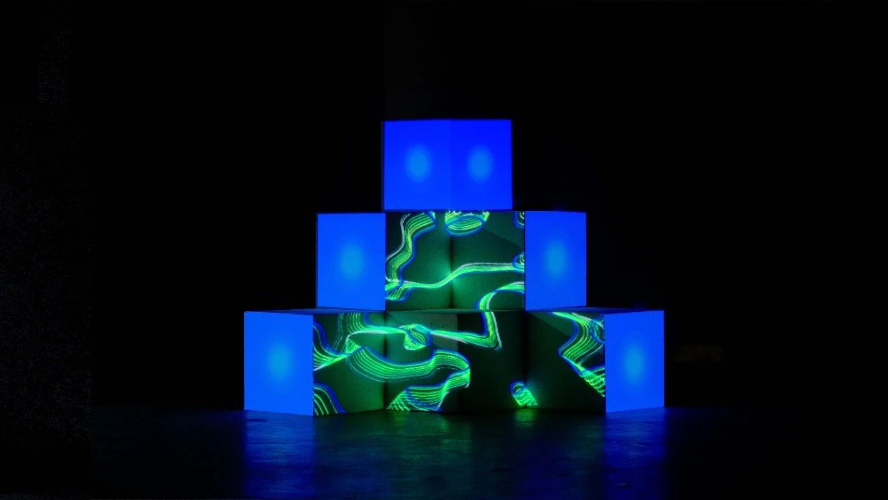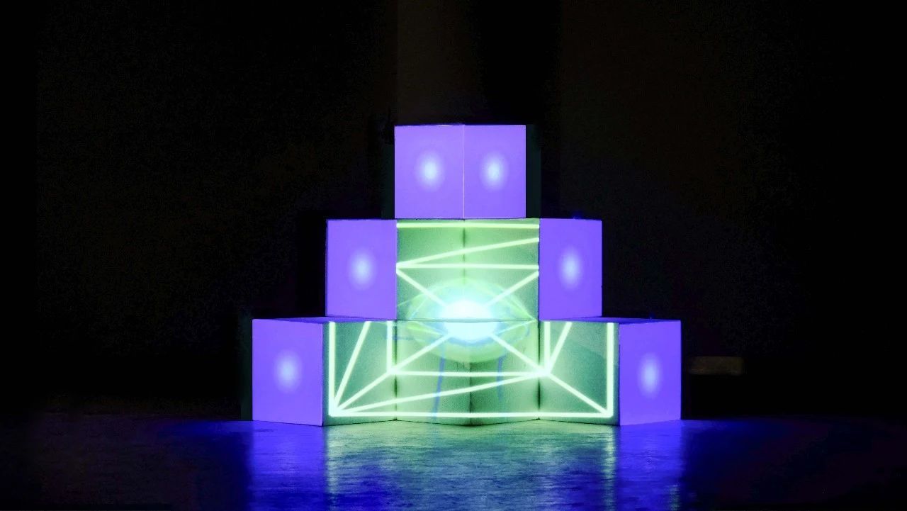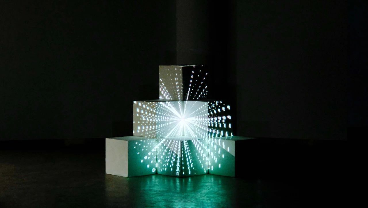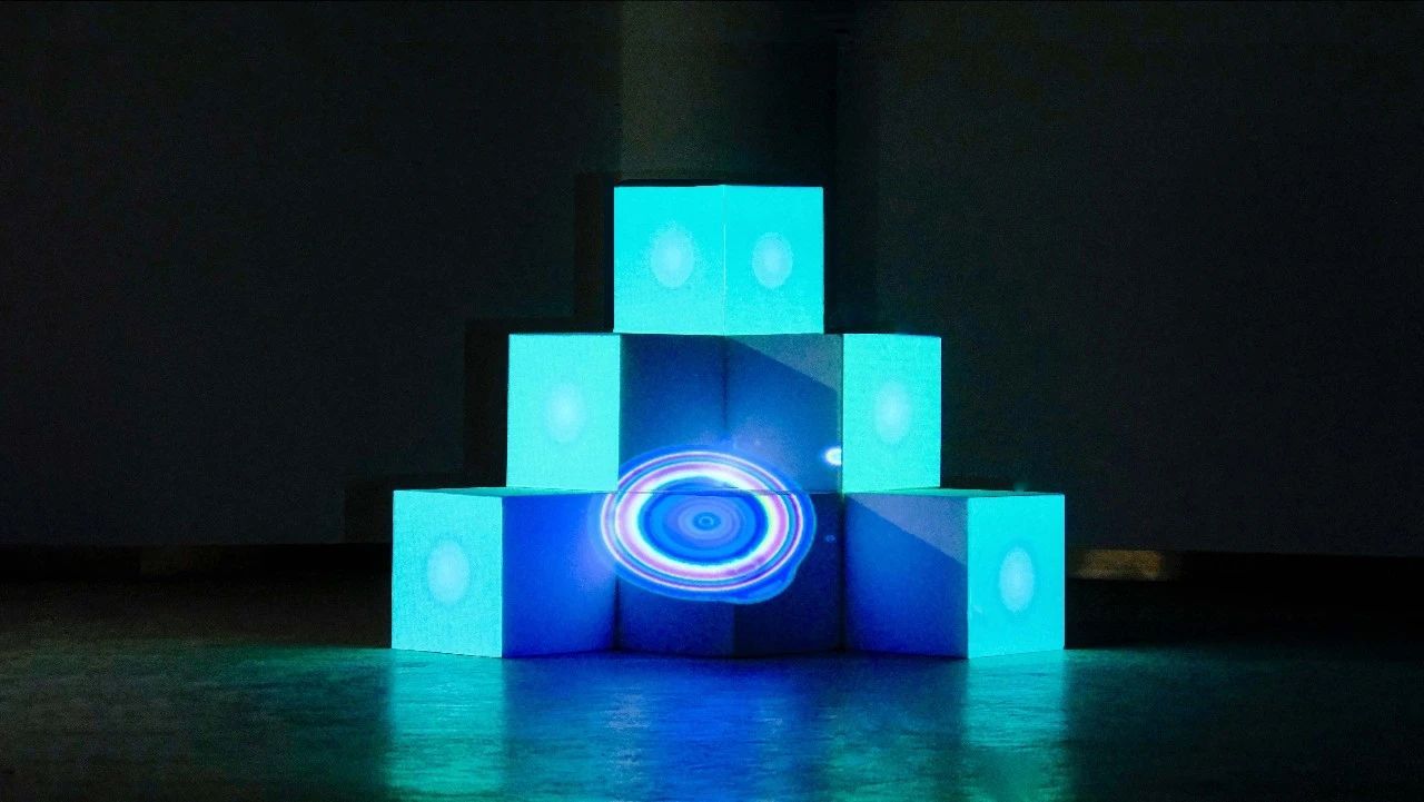 作品概念:作品通过动态分形算法与投影映射技术,从0维的量子光点展开至1维的无限光束,2维的康定斯基式分形平面,3维的立方体运动,最终以四维时空切片呈现粒子流的虚实交叠,展示高维空间的拓扑形态。让观者体验极致的时空之美。