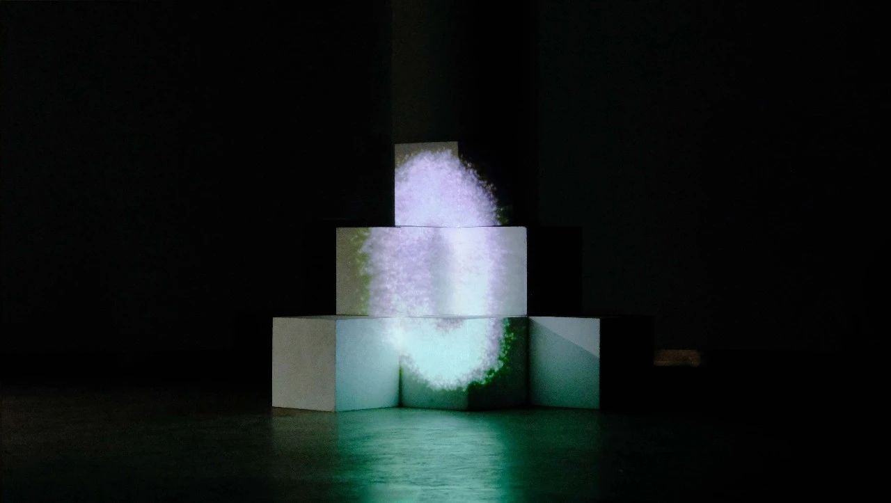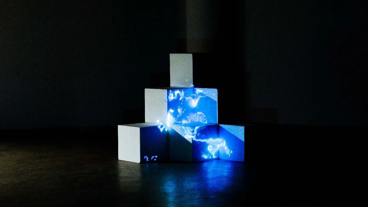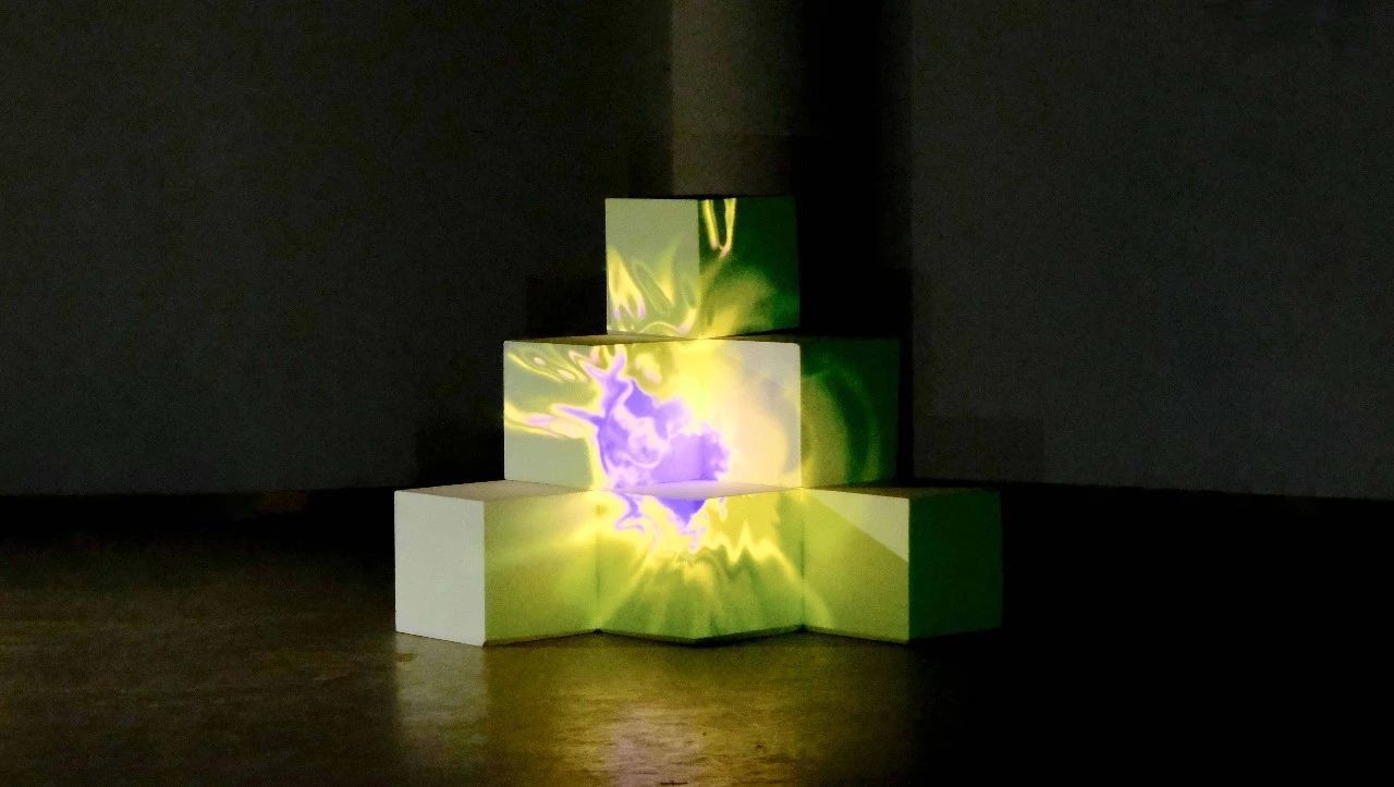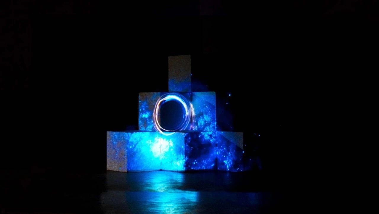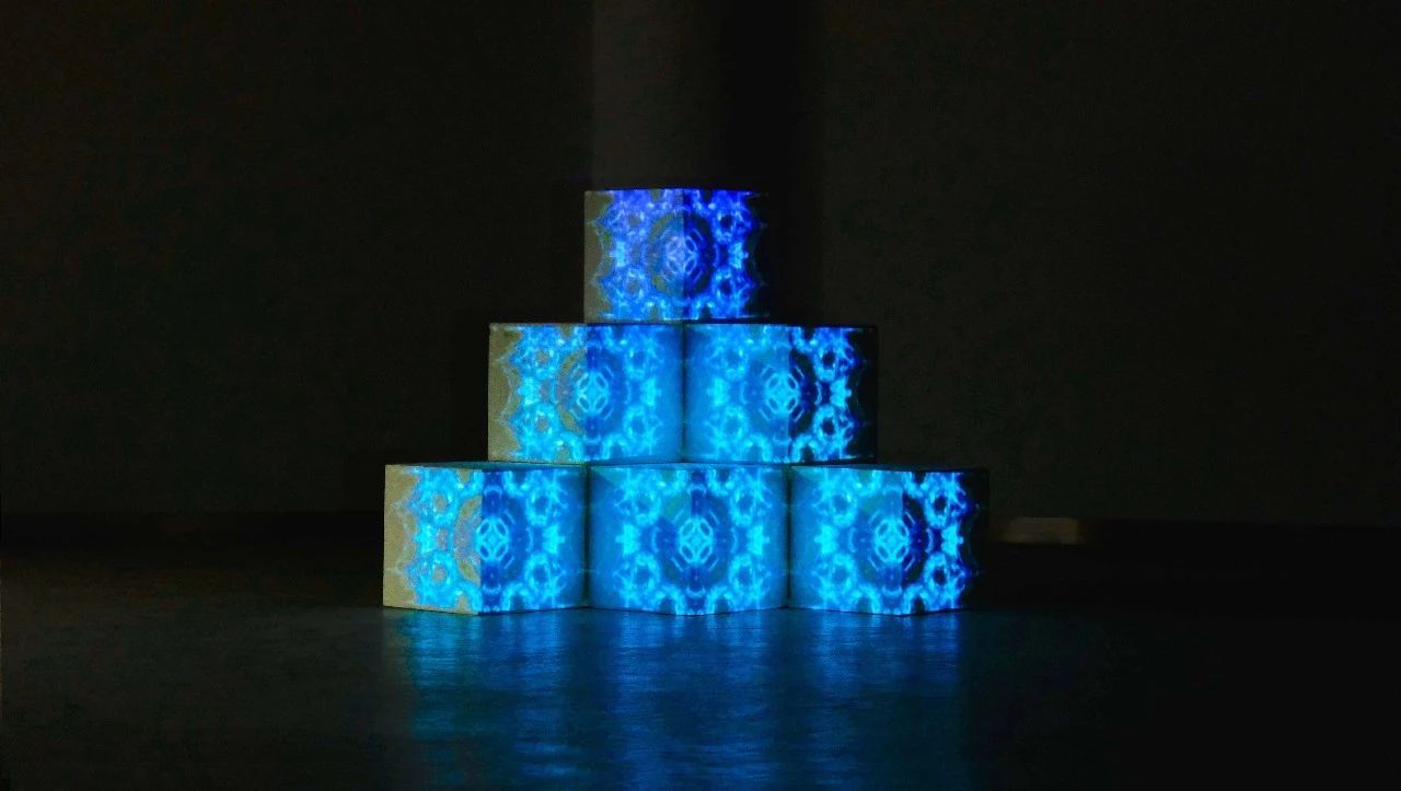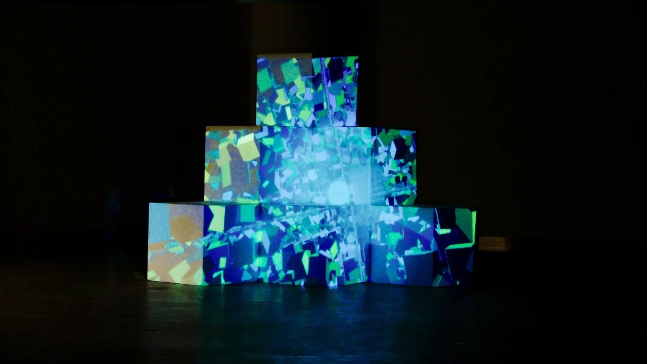 作品概念:作品通过动态分形算法与投影映射技术,从0维的量子光点展开至1维的无限光束,2维的康定斯基式分形平面,3维的立方体运动,最终以四维时空切片呈现粒子流的虚实交叠,展示高维空间的拓扑形态。让观者体验极致的时空之美。