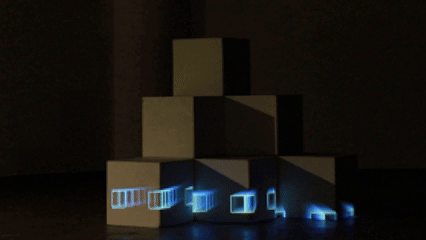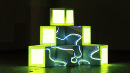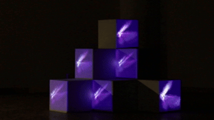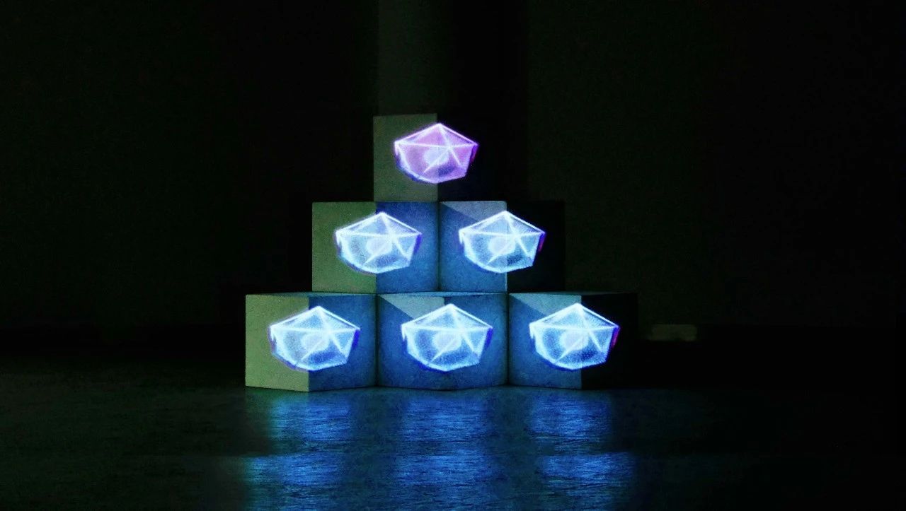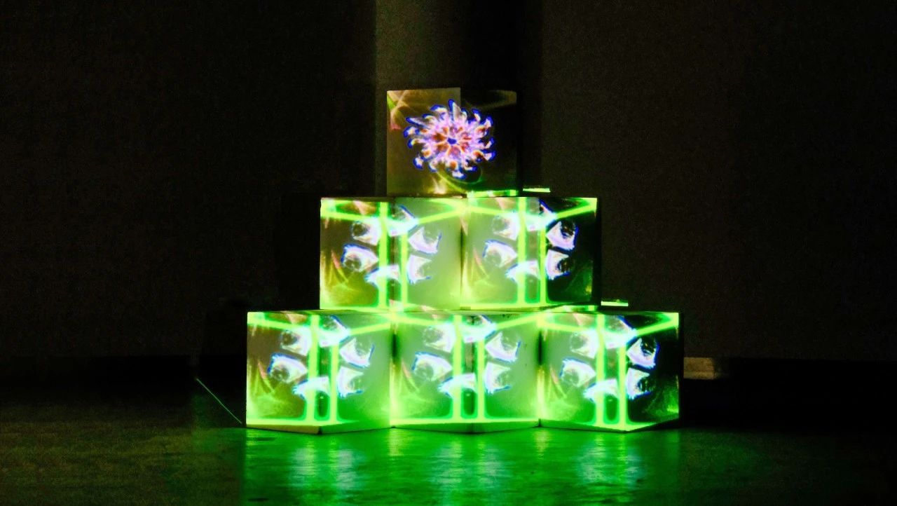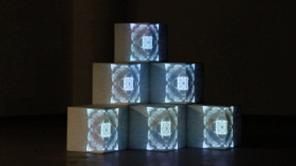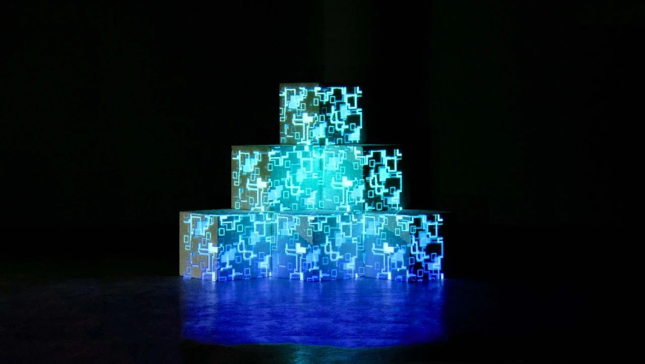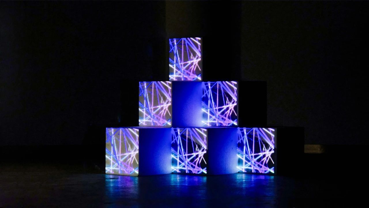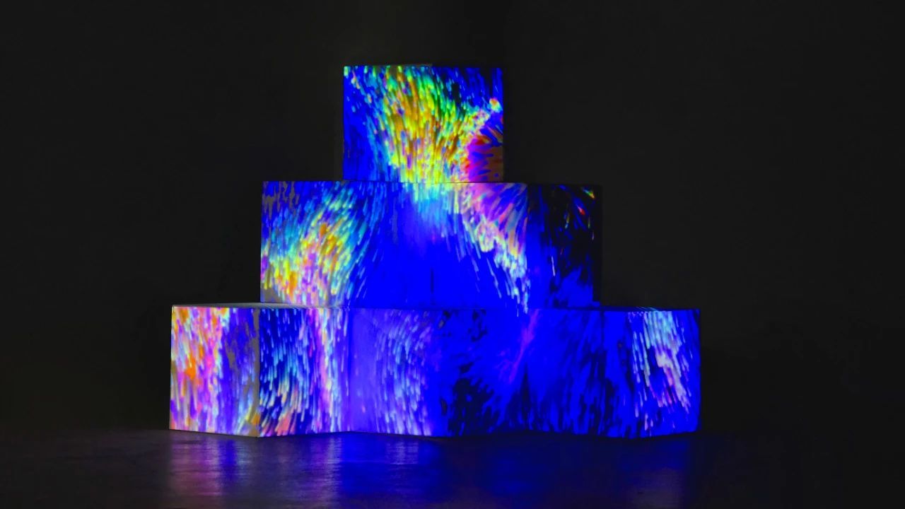 作品概念:作品通过动态分形算法与投影映射技术,从0维的量子光点展开至1维的无限光束,2维的康定斯基式分形平面,3维的立方体运动,最终以四维时空切片呈现粒子流的虚实交叠,展示高维空间的拓扑形态。让观者体验极致的时空之美。