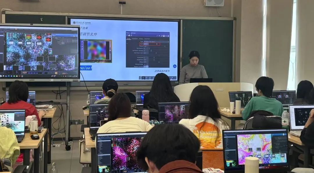 技术学习与案例分析:课程初期,学生系统学习了TouchDesigner软件的基础功能,包括音频分析、图像生成、实时合成与交互控制等模块。通过对优秀案例的解构分析,学生逐渐建立起对媒介艺术语言的理解。