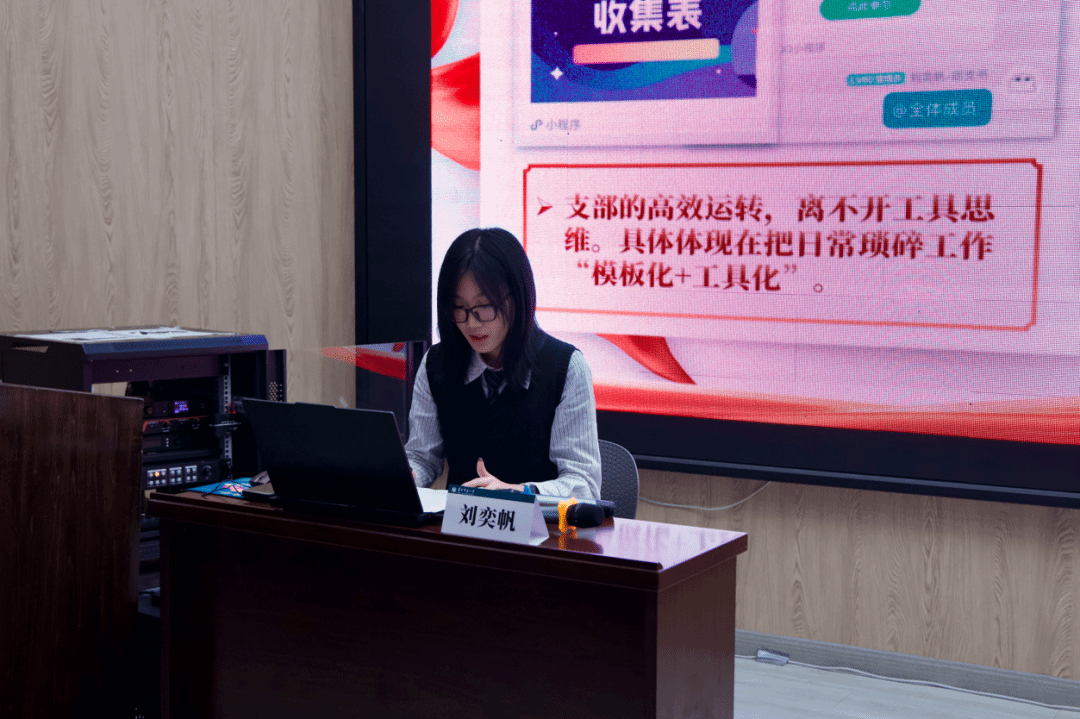 刘奕帆聚焦于基层团支部建设的具体实践。她强调支部建设必须坚持思想引领为核心,将思想引领置于首位,通过多元活动强化理论学习。在工作方法上,她分享了借助信息化工具提升数据整理效率,并通过建立支部成长档案等方式增强成员凝聚力。在品牌活动塑造方面,她介绍了如何紧扣美术专业特色,探索“专业+思政”模式,开展如红色手绘等特色活动,让主题教育生动落地,并强调了日常材料积累与系统化呈现的重要性。此外,她提醒团学骨干注重日常工作积累与材料梳理,做到图文并茂、系统呈现,充分展现支部工作的特色与成果。