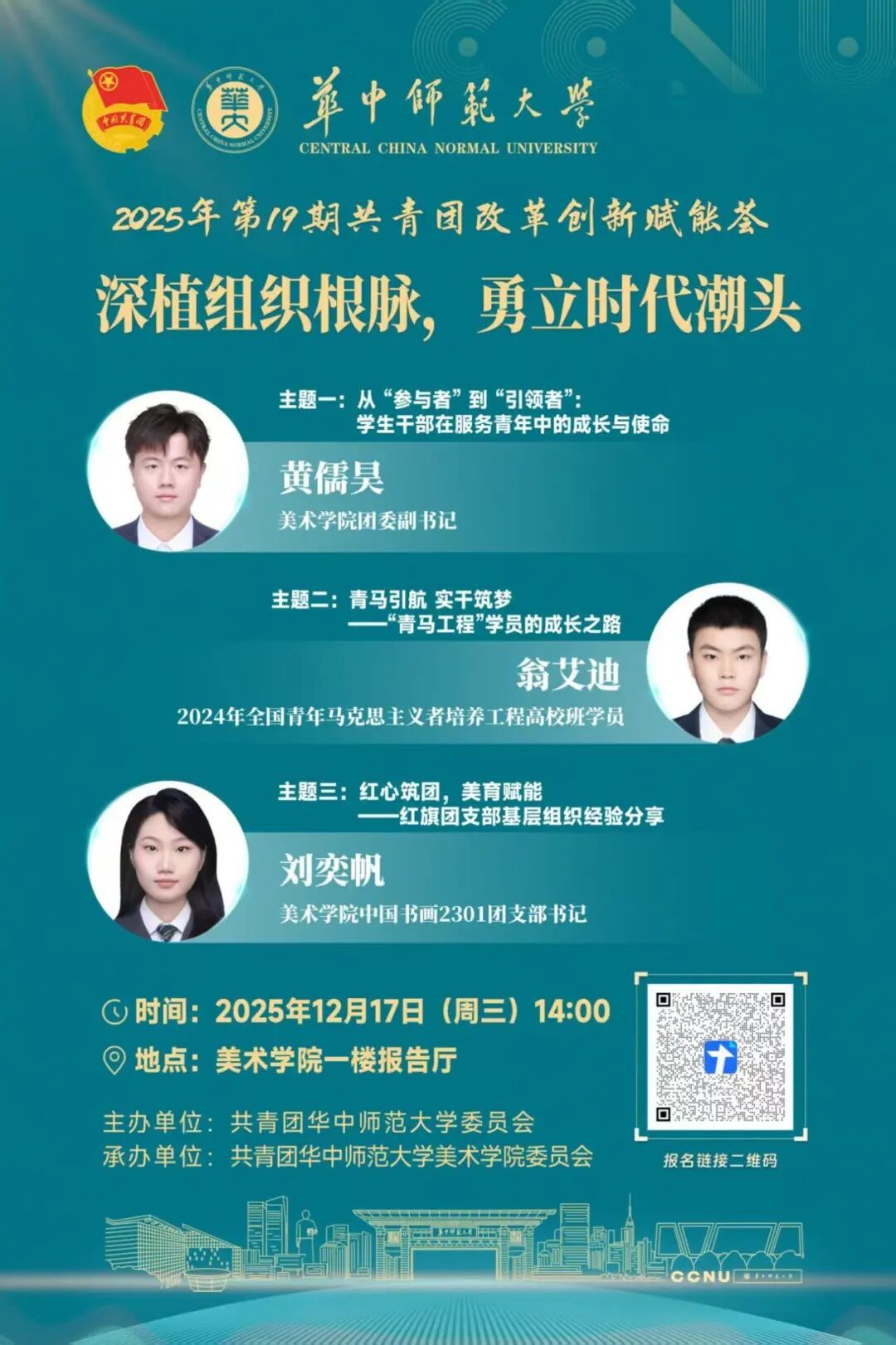为深入贯彻落实共青团深化改革工作要求,凝聚青年思想共识,提升团学骨干业务素养与创新能力,12月17日,第十九期共青团改革创新赋能荟于美术学院一楼报告厅顺利开展。此次活动由共青团华中师范大学委员会主办,共青团华中师范大学美术学院委员会承办,以“深植组织根脉,永立时代潮头”为主题,邀请美术学院团委副书记黄儒昊、2024年全国青年马克思主义者培养工程高校班学员翁艾迪、美术学院中国书画2301班团支部书记刘奕帆作为师生代表分享实践经验,旨在为全校团学骨干构建一个交流互鉴、共同进步的学习平台。