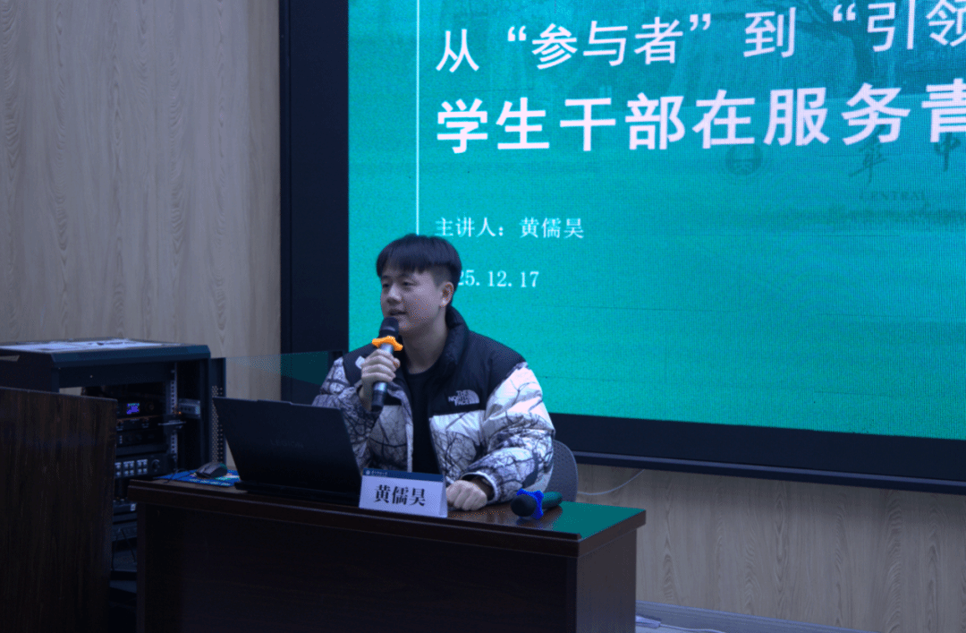 黄儒昊围绕“从参与者到引领者:学生骨干在服务青年中的成长与使命”作专题分享。黄儒昊以个人成长与工作经历为主线,分享了从学生到思政工作者的心路历程。他谈到,在学生工作中,平凡事务蕴含着深远的育人价值,并以统筹校级“百团大战”活动为实例,阐述了以创新方法和责任担当克服困难的重要性,意在鼓励团学骨干勇于突破自我认知,在服务青年的过程中实现从参与者到引领者的角色蜕变,明确自身使命。