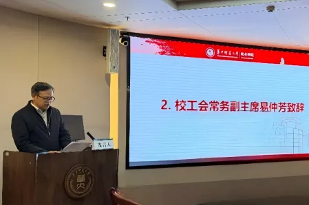 校工会常务副主席易仲芳代表校工会致辞。他指出,美术学院第五届第一次教代会的召开,充分体现了学院党政班子团结带领全体教职工,深入学习贯彻党中央重要精神和决策部署,主动融入教育强国战略,科学谋划学院“十五五”发展蓝图的责任与担当,对学院当前与长远发展具有重要的意义。他对美术学院近年来在学科建设、人才培养、师资队伍建设、社会服务以及工会工作等方面取得的成效予以充分肯定,并对学院工会和教代会工作提出殷切期望。他希望学院始终坚持党的全面领导,紧紧围绕学校与学院中心工作,服务发展大局,持续完善民主管理与民主监督机制,通过规范有序的教代会制度切实保障教职工合法权益,广泛凝聚共识、汇聚力量,为推动学院事业高质量发展提供坚实支撑。