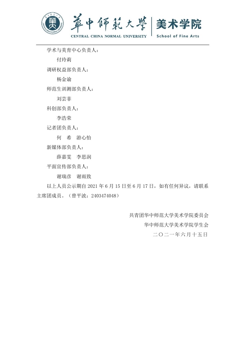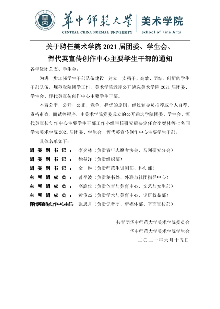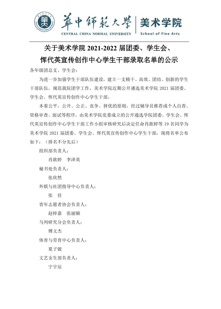 (通讯员:何希)6月10日下午6点30分,美术学院团委学生会部门负责人竞选答辩于美术学院一楼报告厅顺利举行。此次答辩旨在转接院团委学生会工作、更进一步提升学生工作效率、明确各部门发展方向,加强美院学生会组织干部队伍建设,促进学生会综合实力的提升和工作的全面发展,以便于更好的服务学生。本次答辩由华中师范大学美术学院团委书记张锦航、团委副书记汤益迦、7名主席团成员担任评委,由主席团成员金琳同学主持答辩。