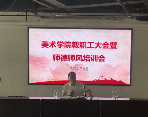 为加强教师队伍建设,弘扬新风正气,提高教师自身修养,美术学院于6月25日上午10:00在八楼博雅美术馆举行教职工大会暨师德师风培训会。会议由美术学院党委书记付义朝主持,美术学院全体教职工参加此次会议。