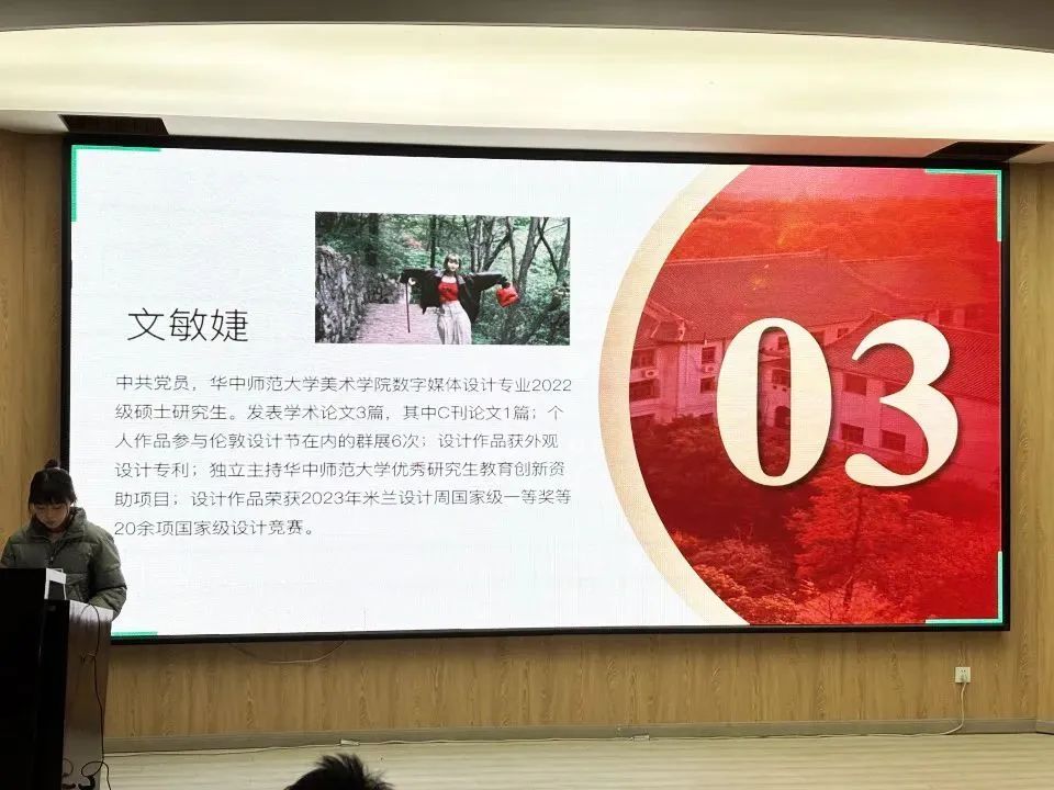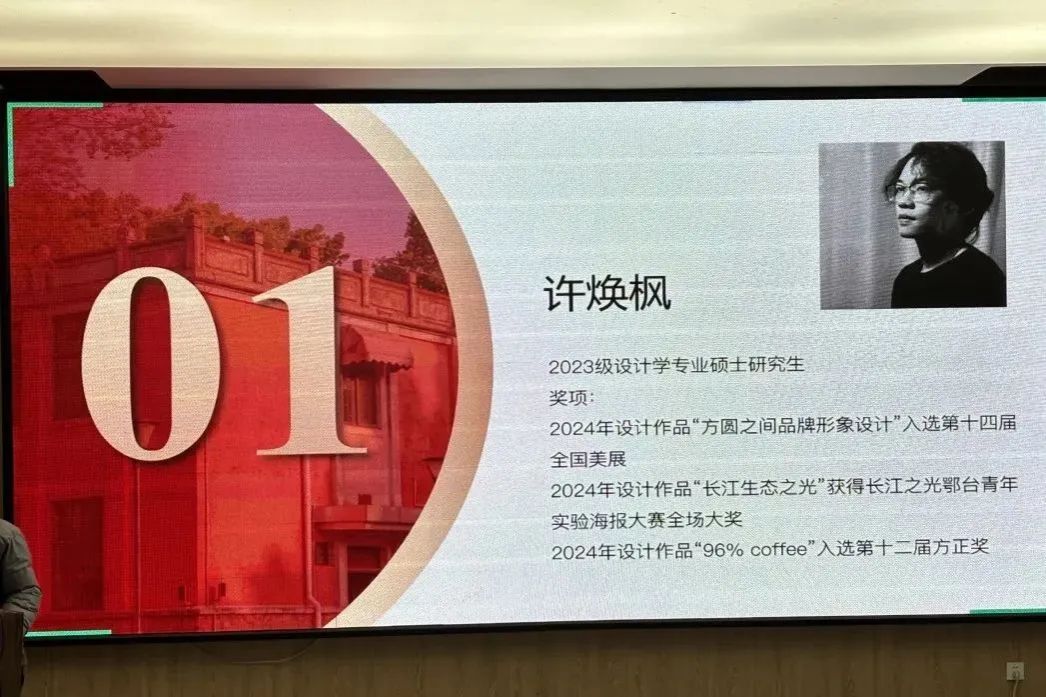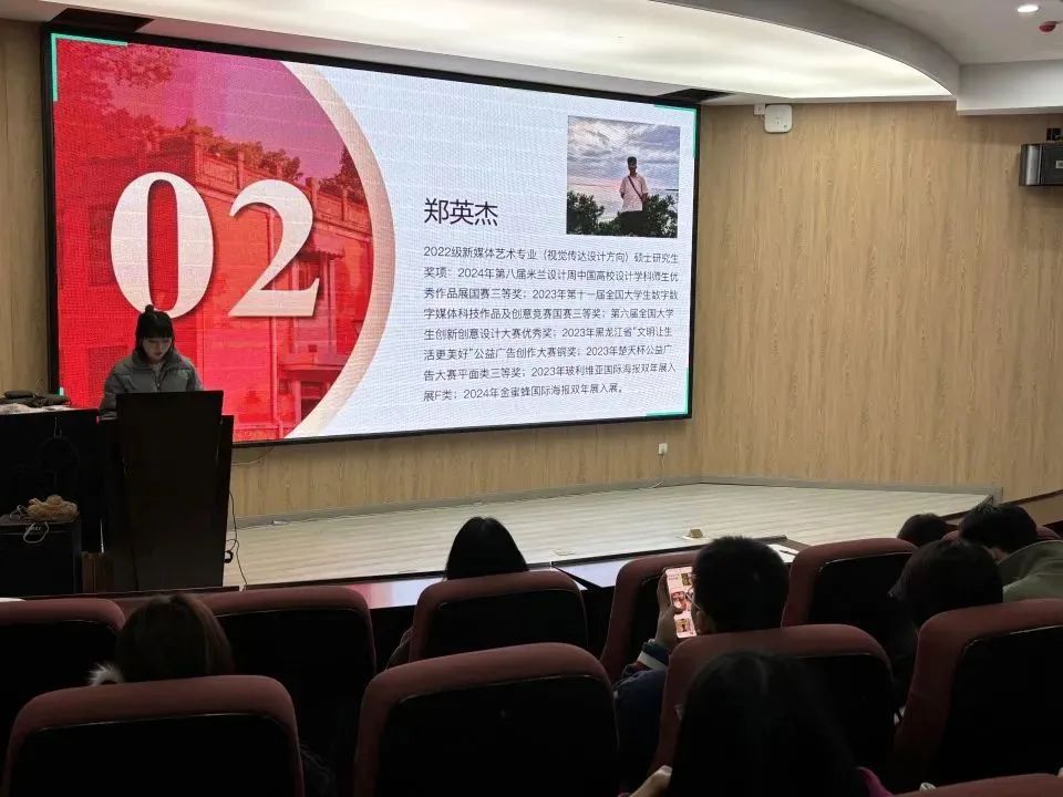 许焕枫(2023级设计学专业硕士研究生)分享了他独到的学习方法、绘画创作中灵感的来源及其创作思路,向大家展示了优秀作品。郑英杰(2022级新媒体艺术专业硕士研究生)强调了要保证英语、政治以及各种不同的专业课程不掉队,确保成绩优异。文敏婕(2022级数字媒体设计专业硕士研究生)从实际出发,给大家列举出了各项赛事的加分细则,以及论文发表经验,并且强调同学们可以积极参加各类有含金量的赛事,为大家提供了可借鉴的学习路径。