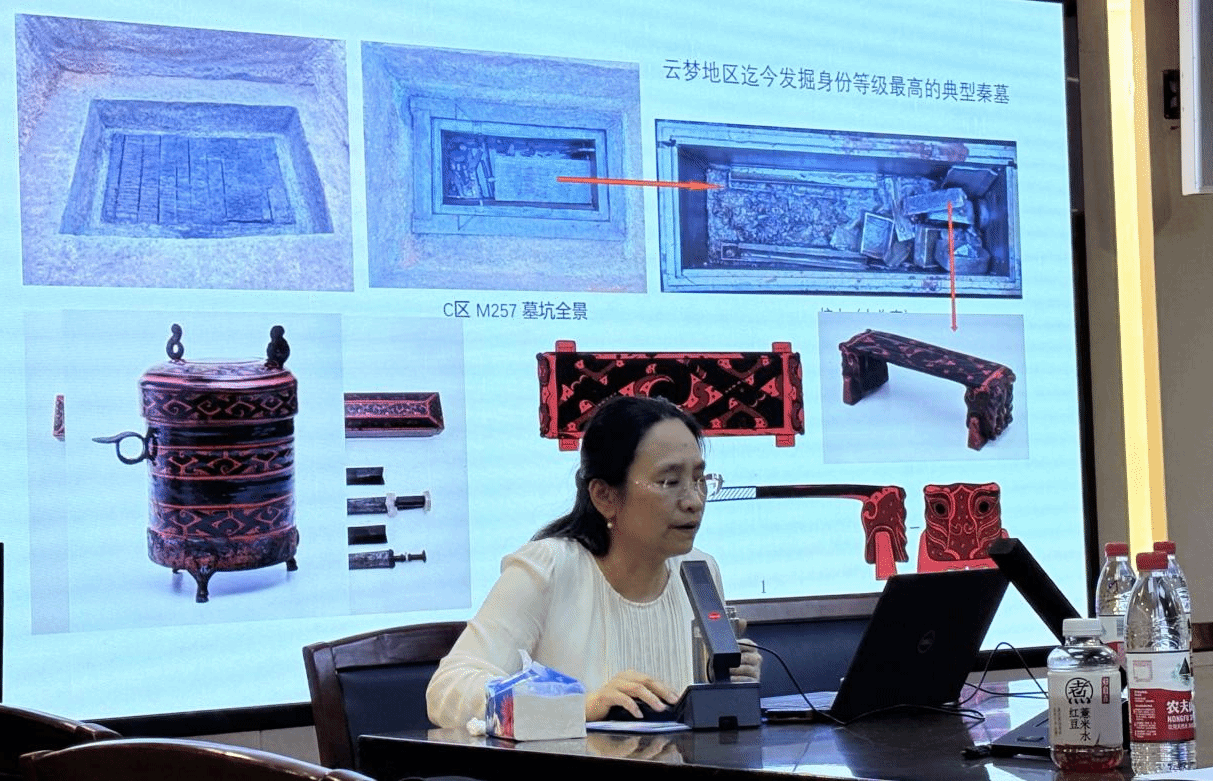 作为项目参与者,李老师分享了云梦郑家湖秦墓群的发掘成果。其中,C 区 9 座饱水墓葬出土700 余件文物,包括木板画、剑匣、耳杯等。她重点介绍了257 号墓(身份等级最高的秦墓)出土的精美漆器,如虎头枕、剑匣套装等,展示了秦代漆器工艺的精湛。