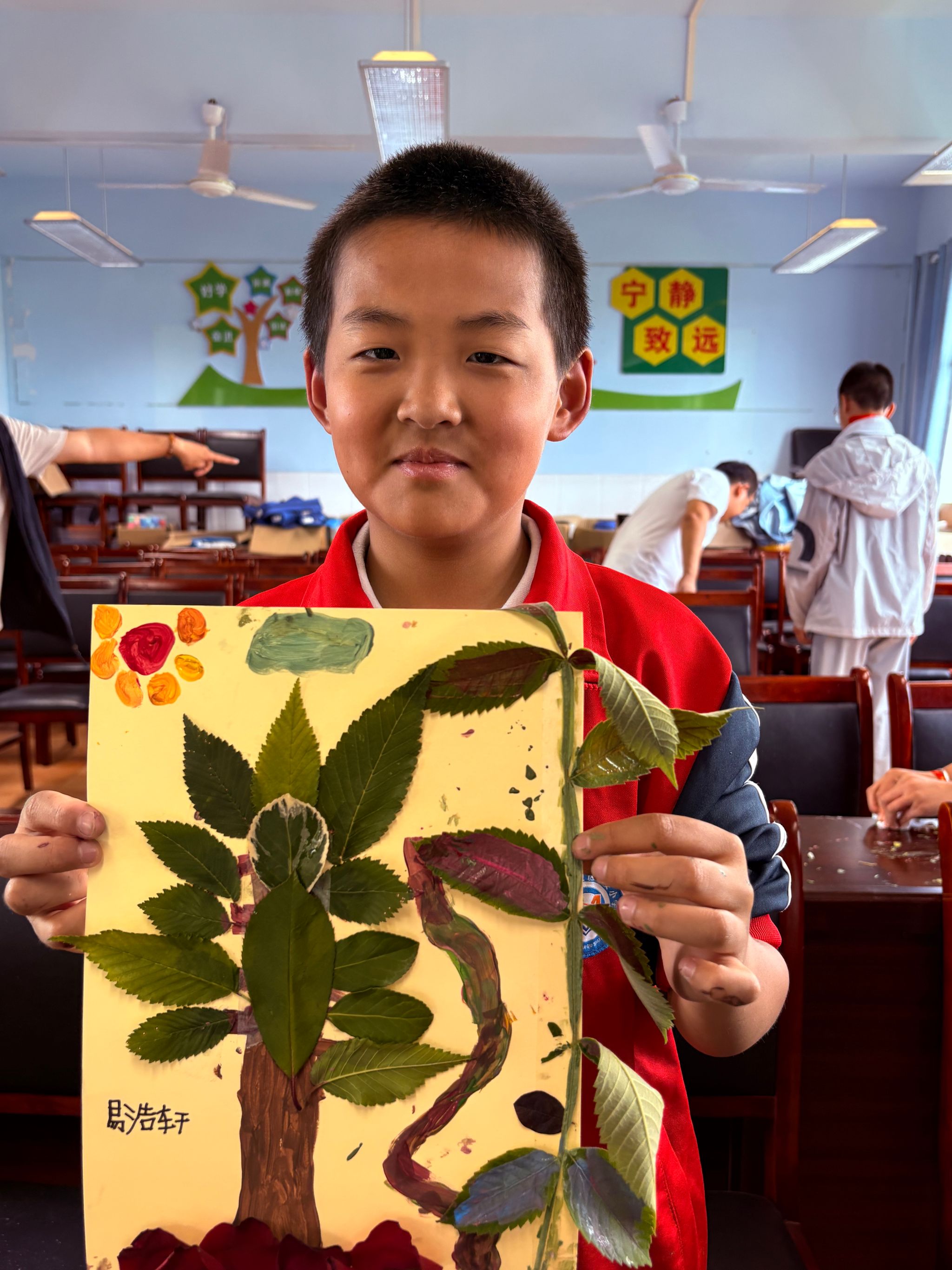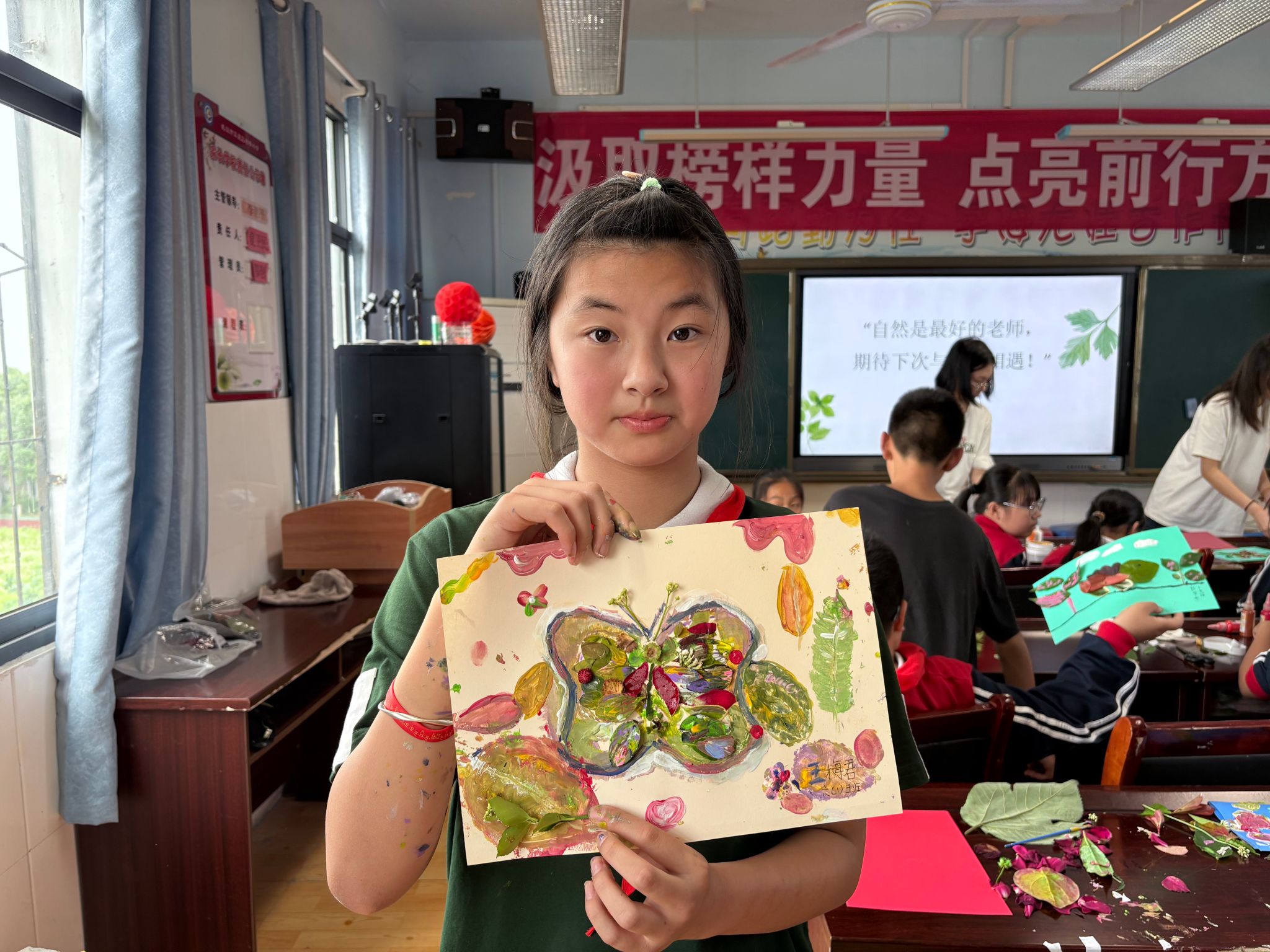 在“树叶的色彩密码”教学环节,欧阳丽莎老师手持带金边的香樟叶启发学生:“春天的树叶只有绿色吗?”起初,孩子们仅能说出“四季单色系”常规认知,但当他们用放大镜观察叶脉、触摸落叶肌理时,四年级学生小雨突然发现:“树叶边缘是红色的!”这一发现如星火燎原,点燃课堂活力。 自由创作中,《风雨后的翅膀》——画面中,一只“树叶蝴蝶”正穿越雨幕,翅膀露珠与彩虹交相辉映。欧阳丽莎老师点评:“自然的‘不完美’,正是创造力的起点。”这幅作品被置顶在教室“自然创意墙”,成为乡村儿童想象力的鲜活注脚。