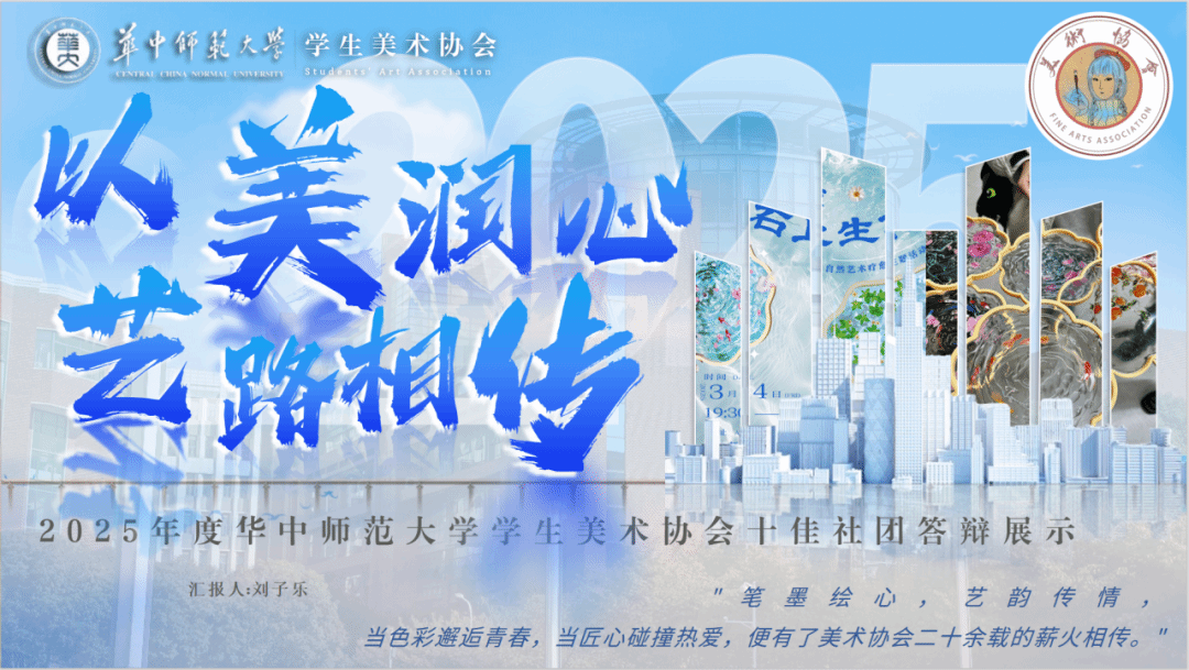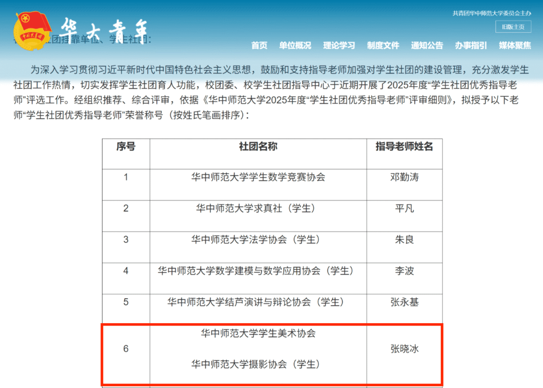 为深入学习贯彻习近平新时代中国特色社会主义思想,充分激发学生社团工作热情,切实发挥学生社团育人功能,校团委、校学生社团指导中心于近期开展了华中师范大学2025年度“十佳社团”与“学生社团优秀指导老师”评选,学院挂靠指导的华中师范大学学生美术协会凭借扎实的建设成果、鲜明的美育特色与出色的现场表现,从全校90+个社团中脱颖而出,成功获评年度“十佳社团”荣誉称号,张晓冰老师获评年度“学生社团优秀指导老师”荣誉称号。