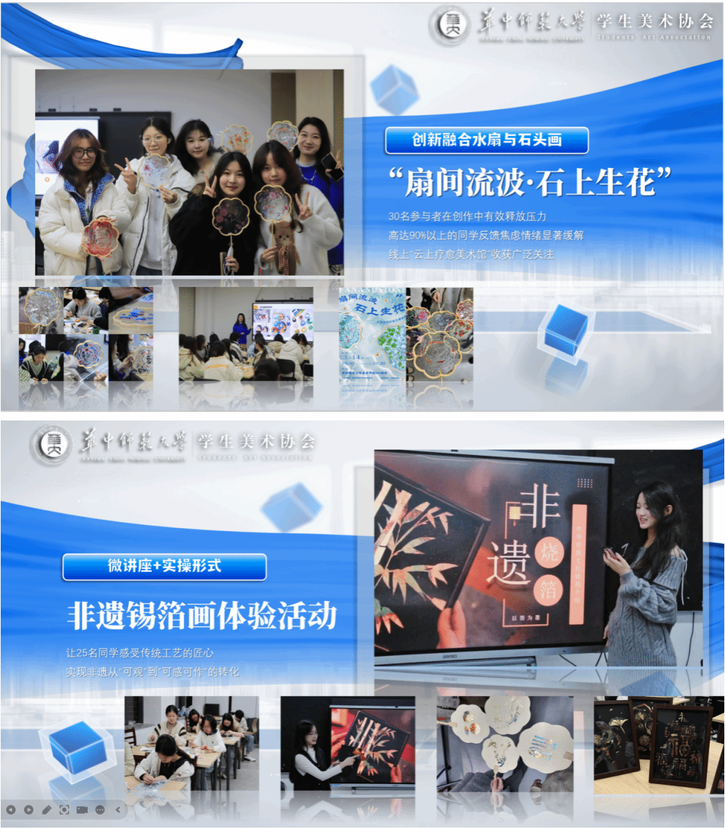 美术协会自成立以来,始终致力于为全校学子搭建艺术实践与文化交流的平台。2025年协会不仅打造了“扇间流波·石上生花”疗愈活动、非遗锡箔画体验等品牌项目,社团成员作品亦在多项国家级、省级专业赛事中斩获佳绩。