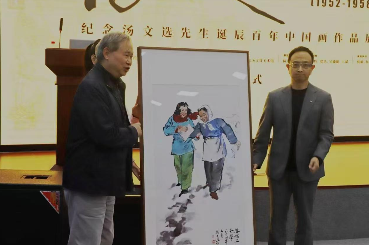 在随后举行的捐赠仪式中,汤文选先生之子汤立将《婆媳上冬学》高清复制作品赠予华中师范大学美术学院。该作品创作于1953年,曾获第二届全国美术作品展一等奖,并被中国美术馆收藏,具有重要的艺术与历史价值。美术学院院长郑达代表学院接受赠礼,并回赠汤文选先生在校任教期间的珍贵教师名册复印件,以文脉延续见证两代情谊。
