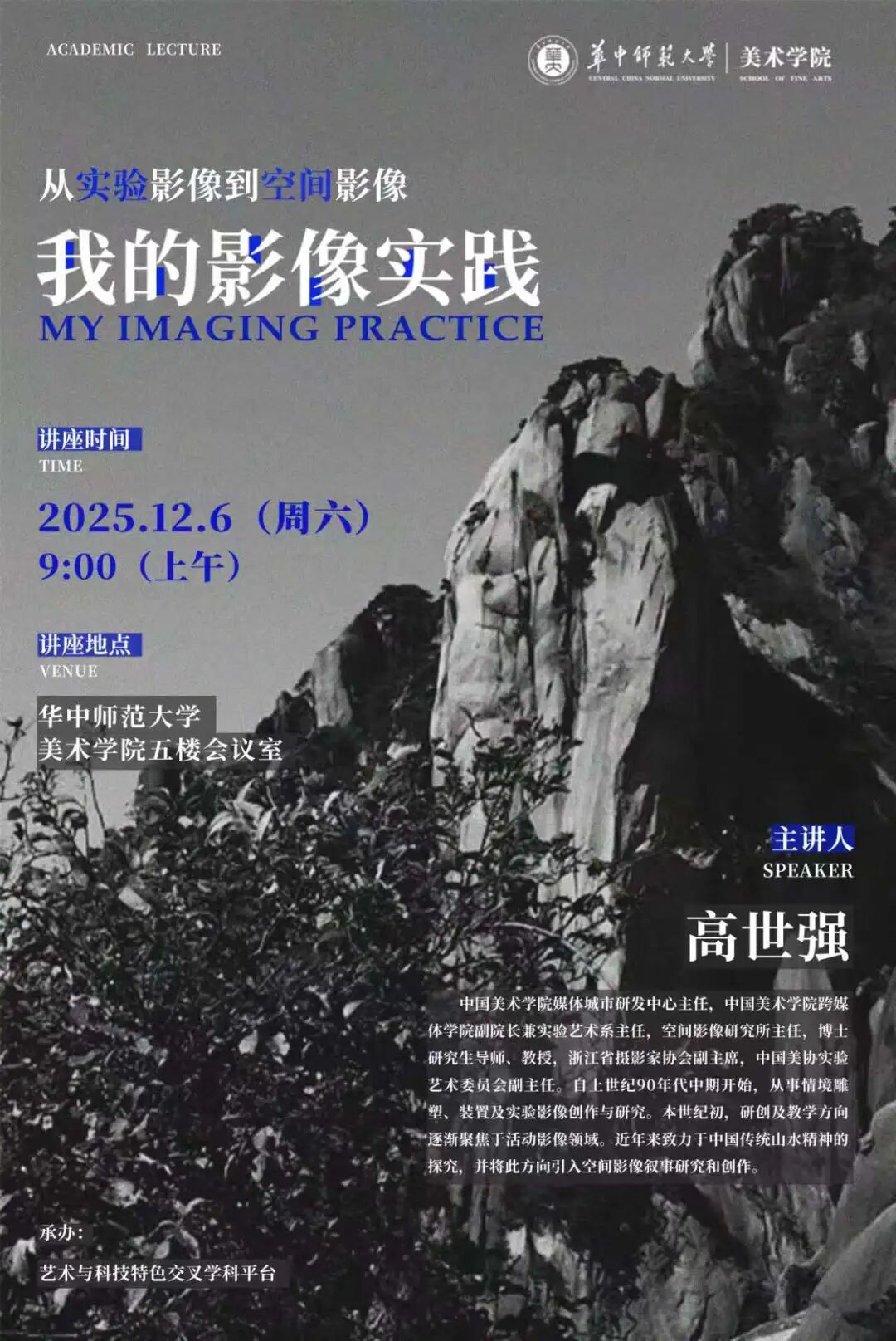 2025年12月6日上午,由艺术与科技特色交叉学科平台主办的学术讲座《从实验影像到空间影像——我的影像实践》在美术学院五楼会议室顺利举行。本次讲座由中国美术学院媒体城市研发中心主任、中国美术学院跨媒体学院副院长高世强教授主讲,华中师范大学美术学院院长郑达教授主持,中国美术学院以及华中师范大学美术学院众多师生参加。