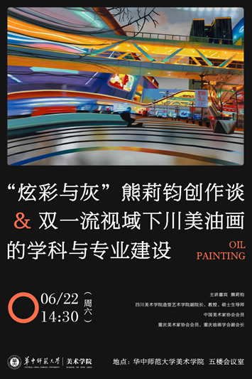 6月22日下午,华中师范大学美术学院邀请四川美术学院熊莉钧教授、耿德法副教授,以《“炫彩与灰”熊莉钧创作谈& 双一流视域下川美油画的学科与专业建设》为题开展了一场精彩的学术讲座,本次讲座由我院庄黎副院长主持。