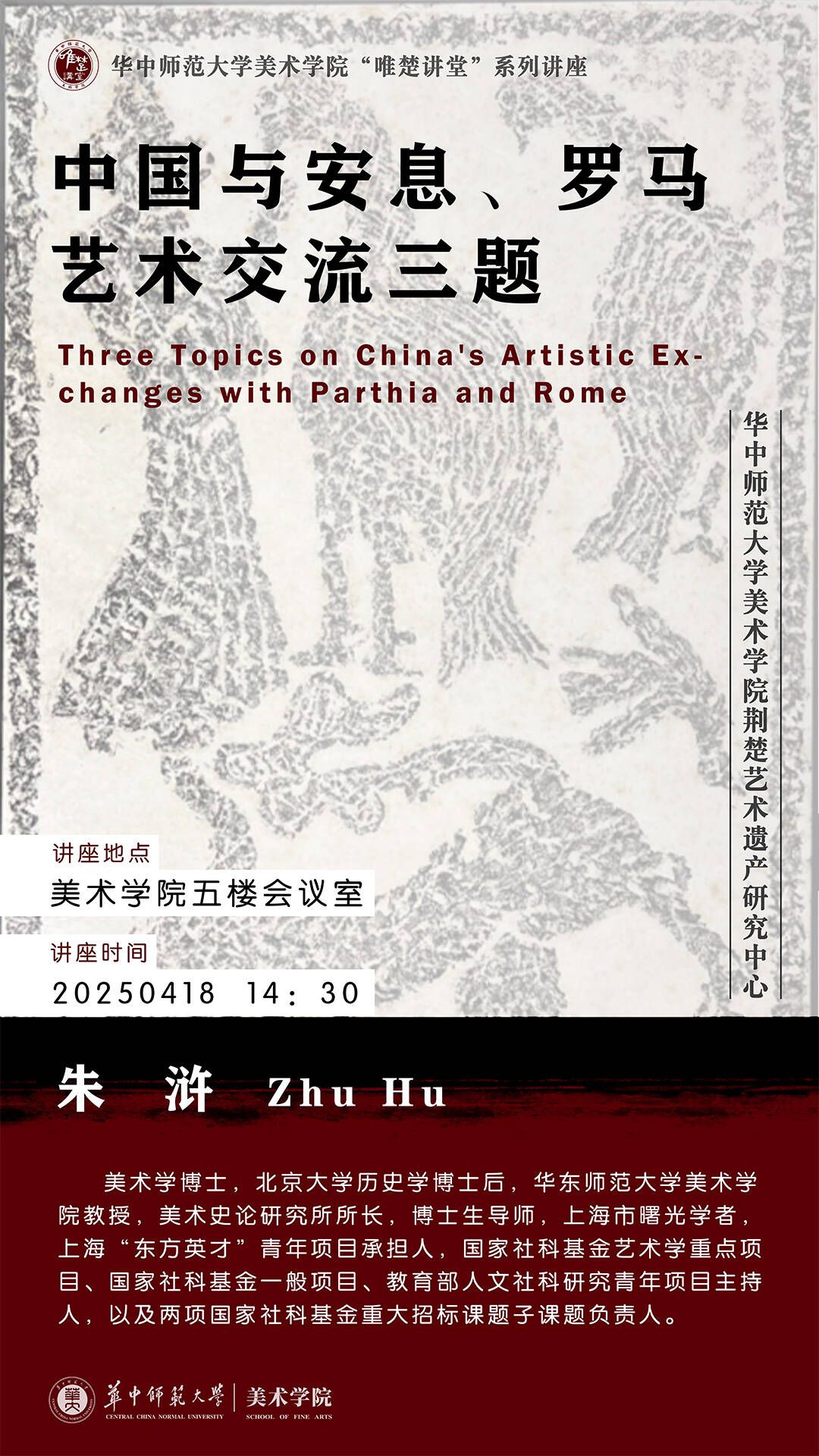 2025年4月18日下午,华中师范大学美术学院主办的“中国与安息、罗马艺术交流三题”专题讲座于美术学院五楼会议室召开。本讲座是由北京大学历史学博士后、美术学博士,华东师范大学美术学院教授,美术史论研究所所长,博士生导师朱浒教授主讲,华中师范大学美术学院副院长蔡敏教授主持,学院诸多师生积极参与。
