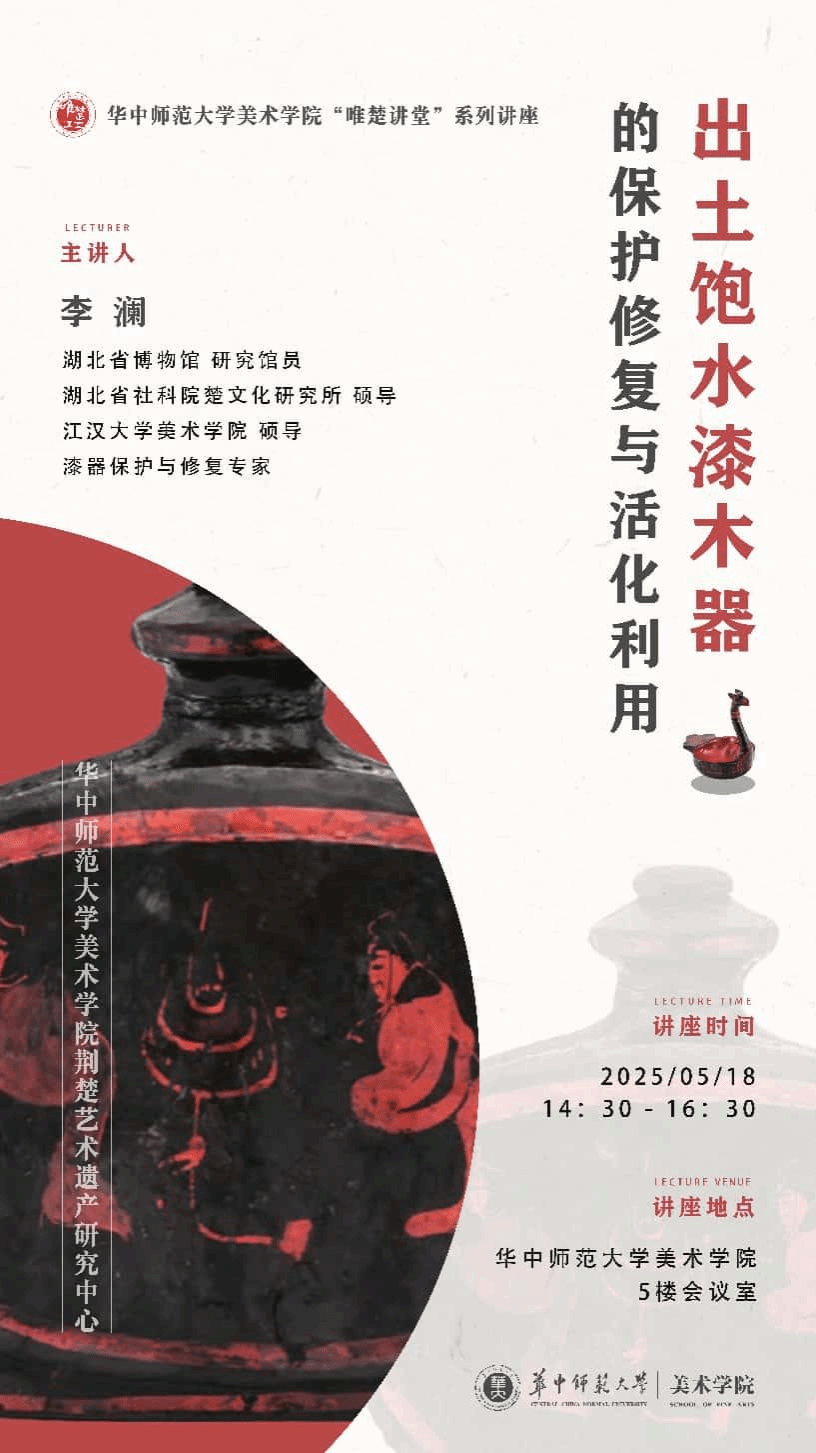 2025年5月18日正值第49个国际博物馆日,湖北省博物馆研究馆员、漆器保护与修复专家李澜老师受邀来华中师范大学美术学院作学术讲座,主题为《出土饱水漆木器的保护修复与活化利用》。本次讲座由陈晓娟老师主持,吸引了众多对文物保护、考古及艺术修复感兴趣的学生和教师参与。