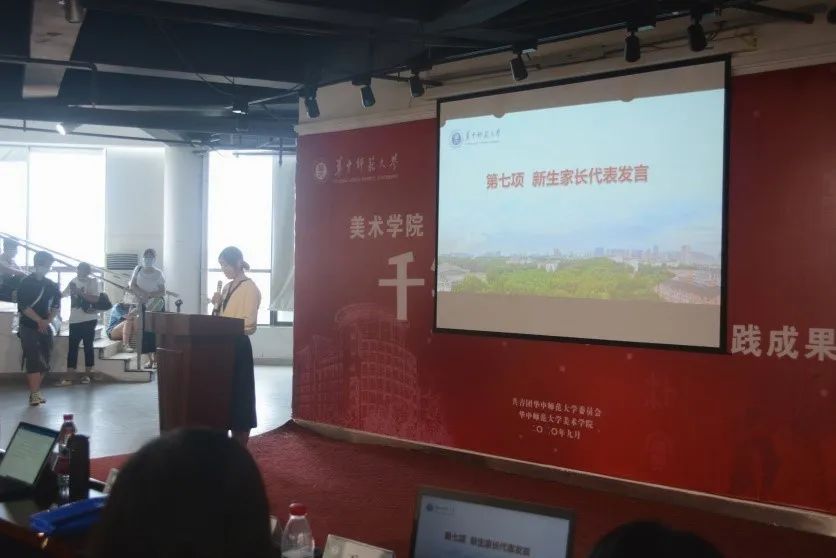 紧接着,由2020届毕业生李佳蔚家长和新生家长代表进行发言。“过去的4年,我和孩子共同成长,见证了华师忠诚博雅、朴实刚毅的教学理念,和老师们辛勤育人的行囊。我的孩子在这里度过了愉快而勤奋的4年,取得了满意的成绩。”家长代表说道。作为一名毕业生的家长,李佳蔚家长还向新生家长们分享了自己的经验,她认为第一步就是要学会放手,让孩子自由的飞翔,并且要时刻关注孩子的心理问题,家长们应和孩子平等的交流。美院以自由开放的学术氛围,给予学生们全面发展的平台,所以家长一定要相信孩子们的无限可能性,鼓励他们多尝试,冲出舒适圈。新生家长代表戴依宁妈妈和李佳禧妈妈则对华中师范大学美术学院给予了充分的肯定。她们表示,华中师范大学有着深厚的文化底蕴,有着雄厚的师资力量。在这里不仅是知识的殿堂,更是梦想的天堂。作为学生的家长未来将全力支持配合学校的教学管理工作,共同为孩子的学业和学校的发展贡献自己的力量。