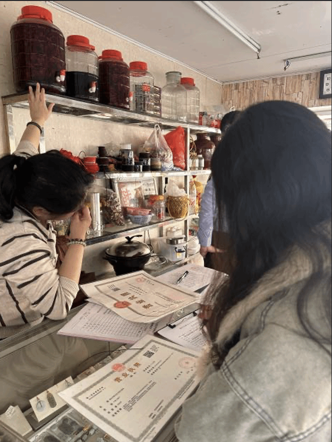 谢雯萱跟市场监管工作人员一起检查商店
