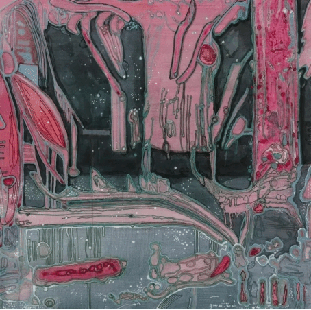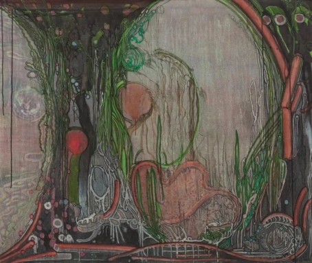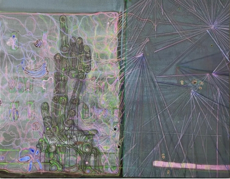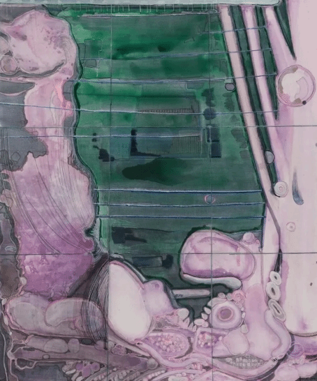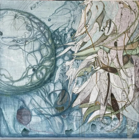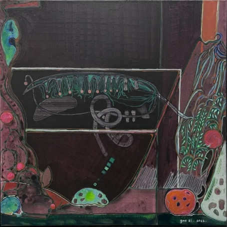 哲学家柏格森认为,“绵延”是一种持续的、不可分割的时间流。艺术既是时间的产物,也是艺术家与感知对象建立对话的意识活动。而事实上,艺术家的意识与感知对象之间存在着空间上的界限,我们日常所处的空间是带有轮廓的空间,于是“破界”成为描绘空间无限的首要任务。而显然,在郭子的绘画中,线条并未成为轮廓的附庸,它们自由地蔓延、灵动地游走、张扬地生长,或延伸到画面的边缘,跳出色域空间的束缚;或交织为网状的结构,被想象为新空间的生成;或异化为奇特的形状切片,搅动画面的“预先”布局——点、线、面的交错与释放,构成了视觉感知催化下的多维生长。郭子描绘的空间是开放的空间,她以画面为媒介,打破空间设置的界限,搭建了一个又一个独立于现实世界之外的想象空间,进而勾勒出艺术家内在本我与外在事物持续对话意识流动的视觉轨迹。