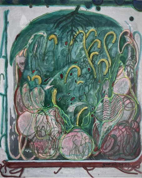 艺术的创造在时间之中进行。郭子画面的天马行空以及近作有意识的“去具象化”,透露出她作为生命个体试图摆脱传统时间钳制的主观诉求。时间的流逝,总是令人既熟悉又陌生,秒、时、年的洪流将我们投向生命,又将我们抛向未来,郭子对摆脱钳制的诉求并非是要脱离时间,而是尝试以线条、色彩与技法合力下情感秩序的抽离与再建构来丰富对时间的感知,进而实现艺术家置身浩瀚时间与宇宙,畅游于记忆与未来之间的再创造。由此,绘画于郭子而言,是全身心投入艺术创作的过程。心理学家米哈里将人们在专注进行某行为时所表现出的心理状态称之为“心流”,而当艺术家专注沉浸于对画面的描绘时,其内心的心理时间被无限延长了。通过对郭子画面的观察,不难体会到其对“可见物”的主观过滤,对图像符号的无意识回避,以及对瞬间情绪的慢处理,它们同频于郭子内心无限延长的心理时间,不偏执于过往微观经验的惯性提示,不纠结于必须抵达的具体目标,恰如绵延的心流,牵引出郭子在现实之外所试图创造的想象世界。