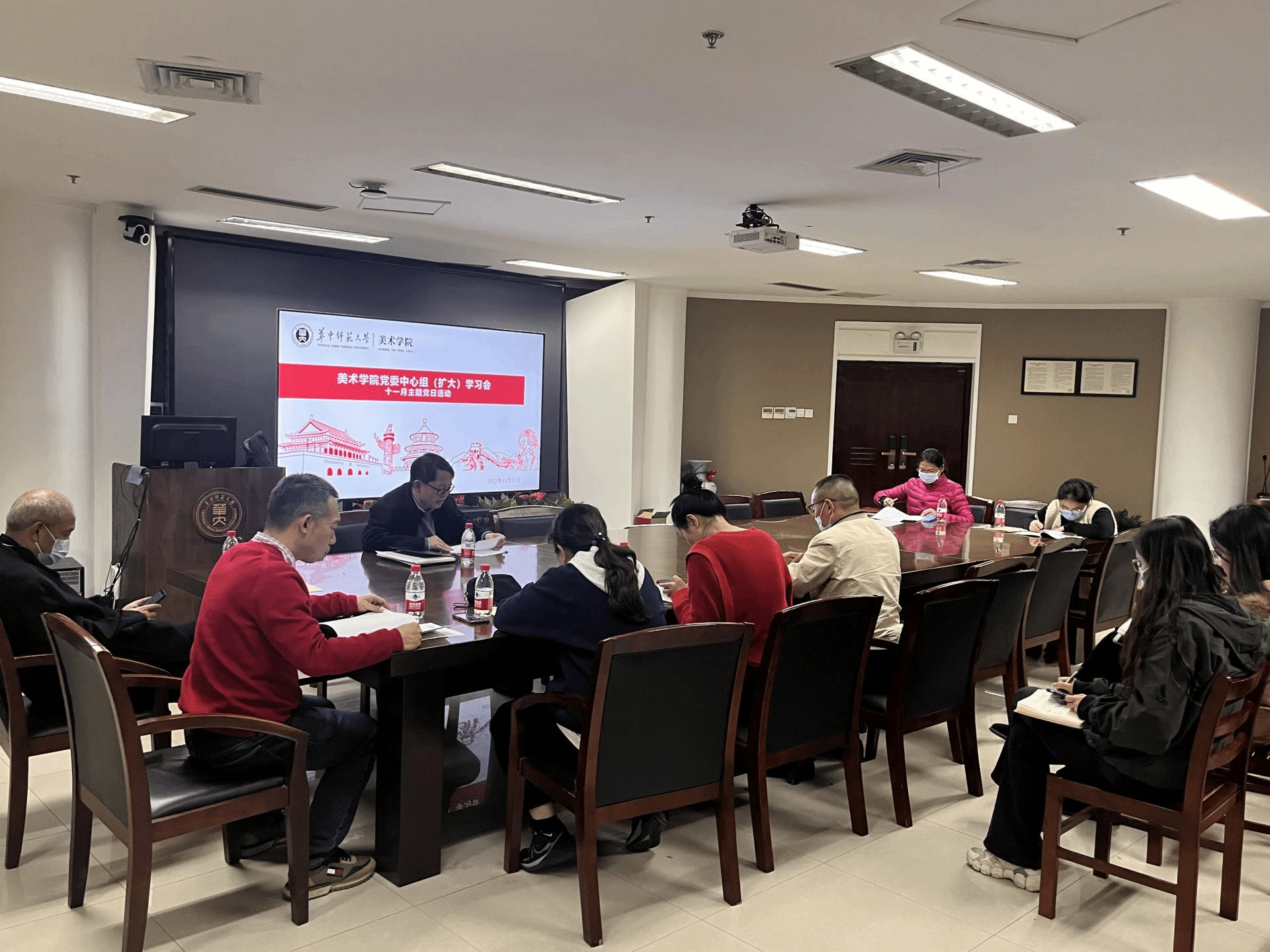 11月17日下午,美术学院分党委在五楼会议室召开分党委中心组(扩大)学习会十一月主题党日活动。学院党委委员,各党支部书记及行政支部全体党员参加学习。会议由学院党委书记付义朝主持。