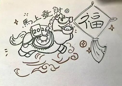 同学们还精心勾勒马年主题书画图案,让跃动的马儿带着美好祝福跨越山海。板绘作品《马年纳福》中,卡通小马憨态可掬,系着红围巾,手持“福”字,红黄简约配色间满溢新年的喜庆氛围;手绘《马上发财》别出心裁,线条勾勒的骏马驮着“2026”方印,蹄捧金元宝,缰绳化作祥云幡旗,灵动可爱之余,藏尽新春招财纳福的美好期许。