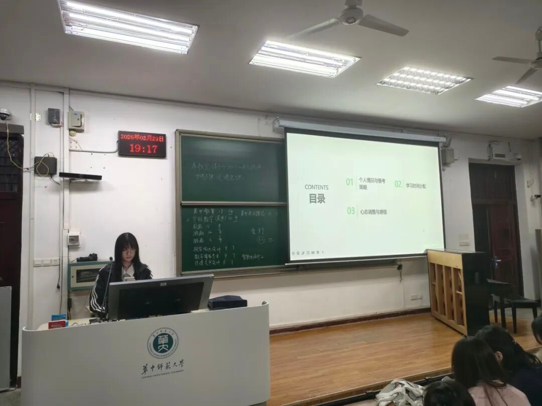 活动伊始,张泽如同学首先进行“思想政治理论”备考经验分享。她提出,备考策略要在基础中挖掘深度,在复盘里梳理逻辑,在焦虑中坚守初心。她从整体备考规划、备考资源整合、主客观题解题技巧、错题整理方法及备考心态调节等多个维度展开细致讲解,结合自身备考经历给出了诸多实操建议。张泽如同学着重强调,良好的心态是考研成功的重要基石,唯有保持规律健康的作息,做到劳逸结合,才能以最佳状态投入备考。